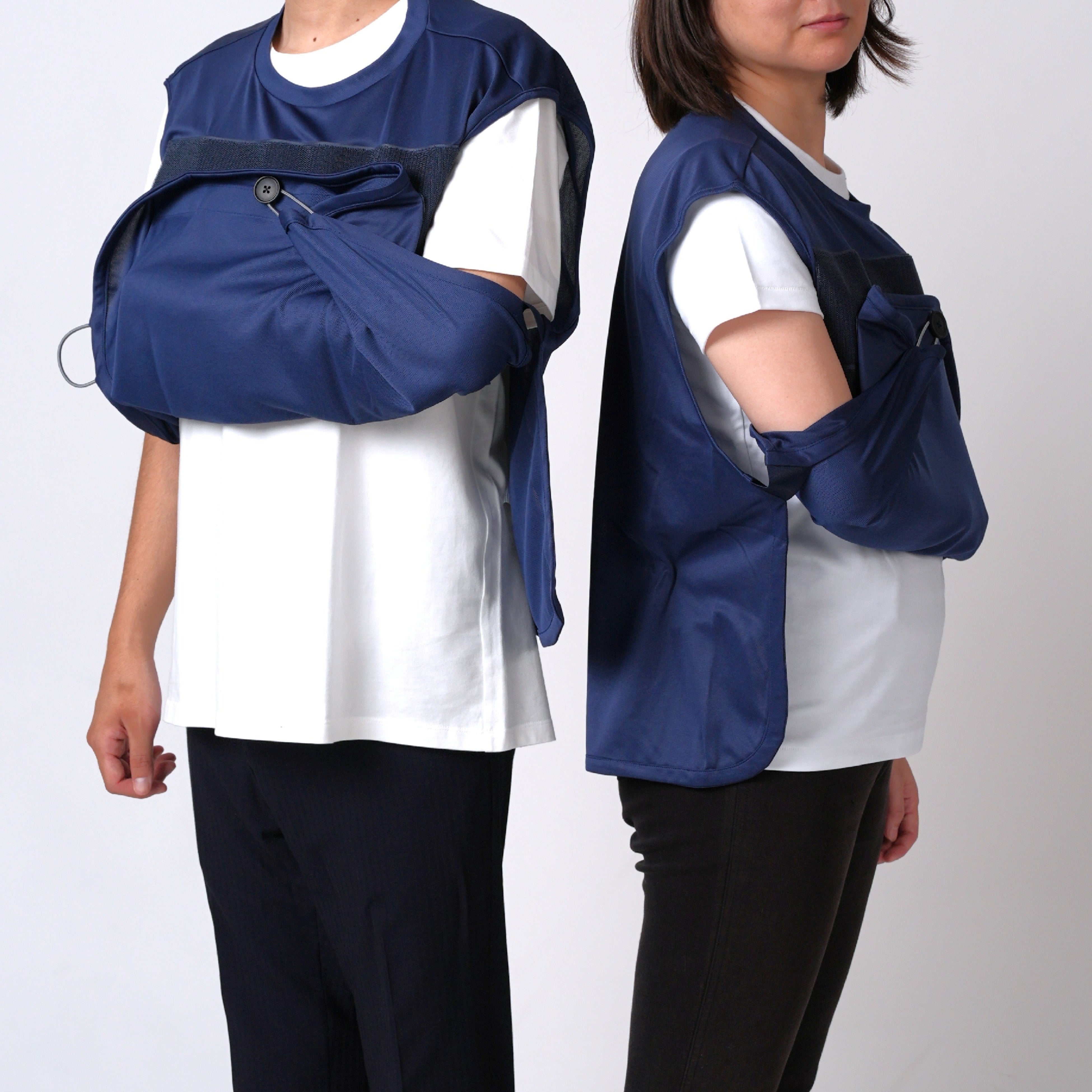 アームスリング(三角巾)と一体化した服。生地全体で腕を支えることで、腕の荷重が分散されるため、長く着用しても疲れにくい。