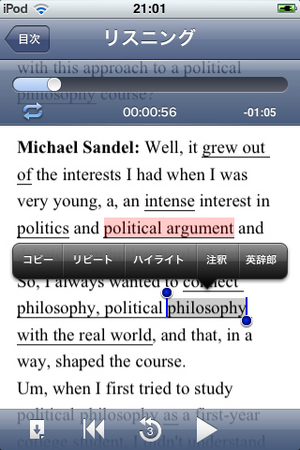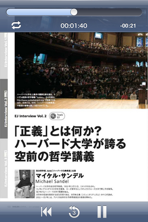 『ENGLISH JOURNAL』 2010年7月号掲載で話題を呼んだ、NHK「ハーバード白熱教室」で知られるマイケル・サンデル教授へのインタビュー(音声付)が 収録されています。ブックビューア」「リスニングツール」など「ENGLISH JOURNAL for iPhone」のさまざまな機能が体験できます。