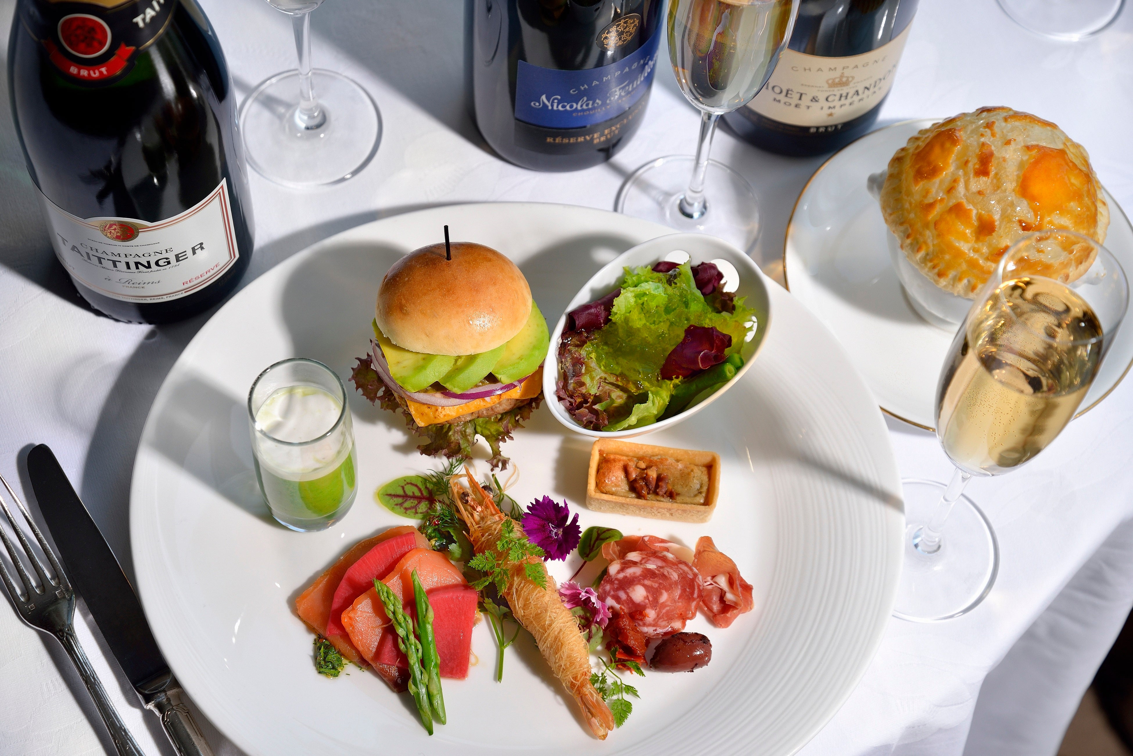 シャンパンと一緒にお楽しみいただくオードブルプレートでは、クルミのキャラメリゼをのせたロックフォールチーズ(ブルーチーズ)のベイクドやアボカドとチェダーチーズなどが入ったボリューム満点のアボカドバーガー、新緑に浮かぶ東京雲海の風景をイメージした「小松菜とアーモンドミルクの冷製スープ」や、別皿でご用意する牛肉のパイ包み焼き等、シャンパンに合うメニューをご賞味いただけます。