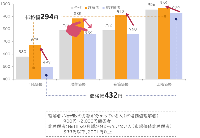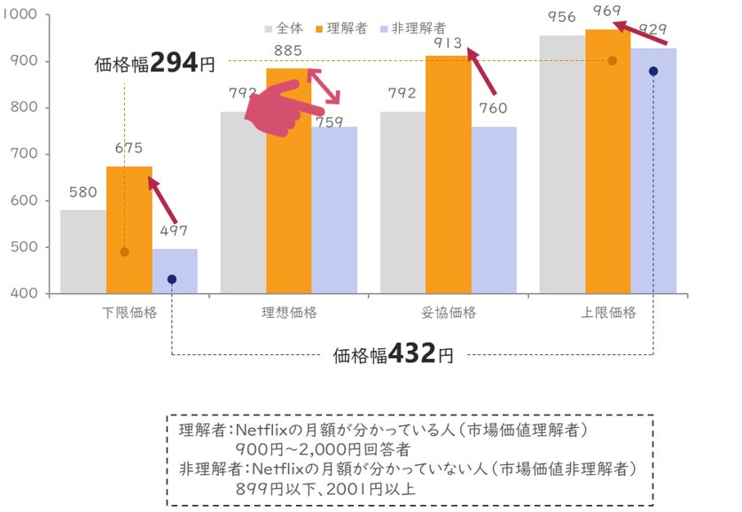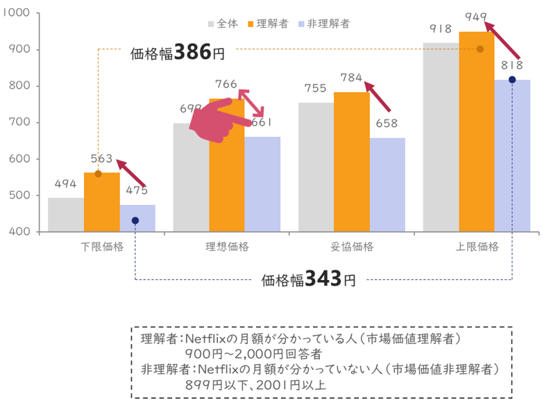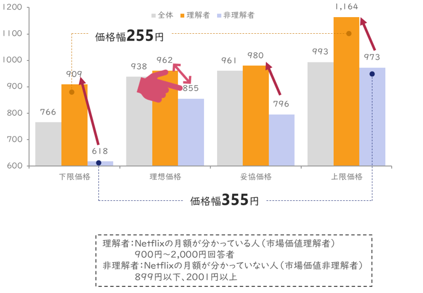 理解者の理想価格は962円、非理解者の理想価格は855円で約107円の差