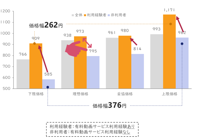 経験者の理想価格は973円、非利用者の理想価格は795円で約178円の差