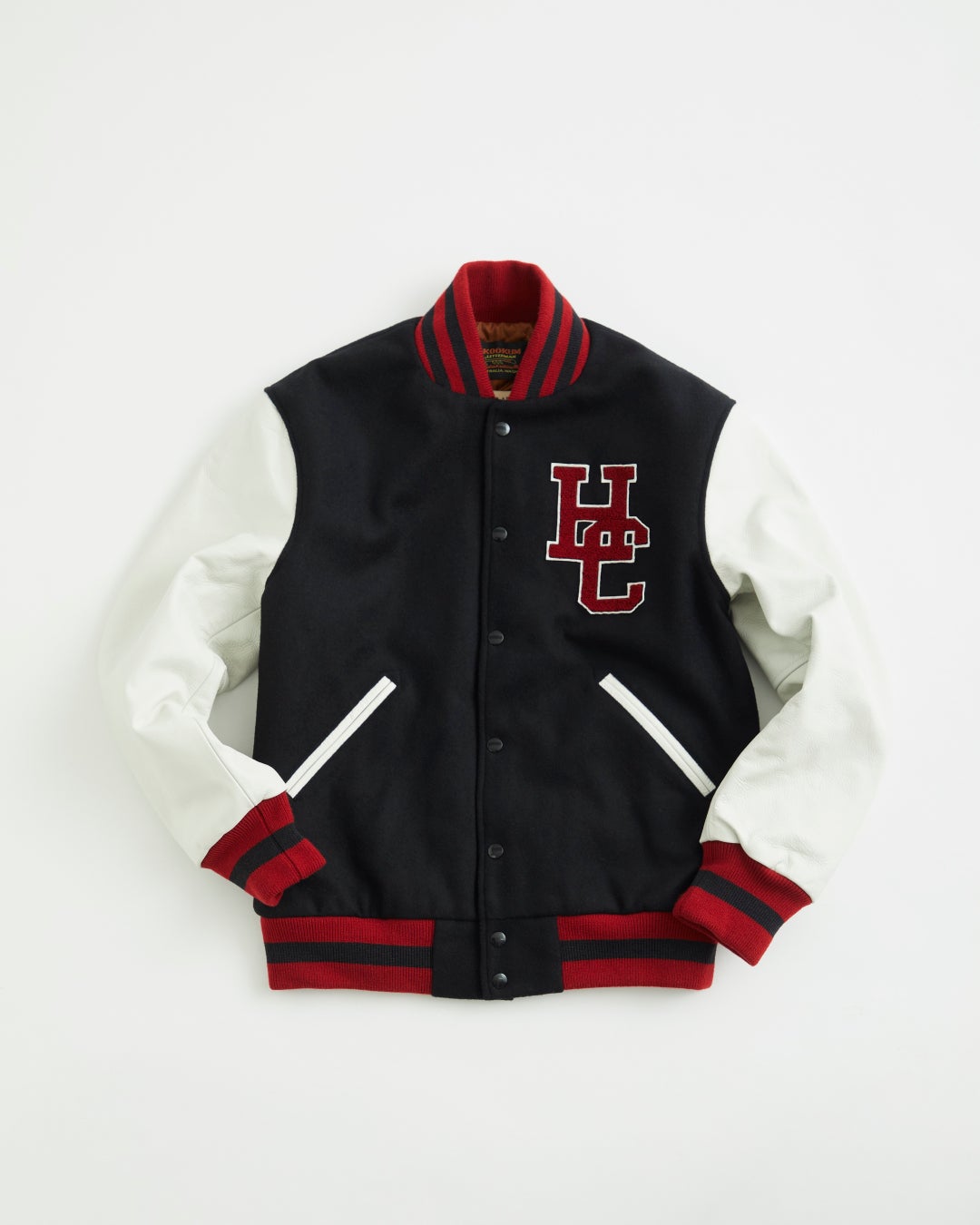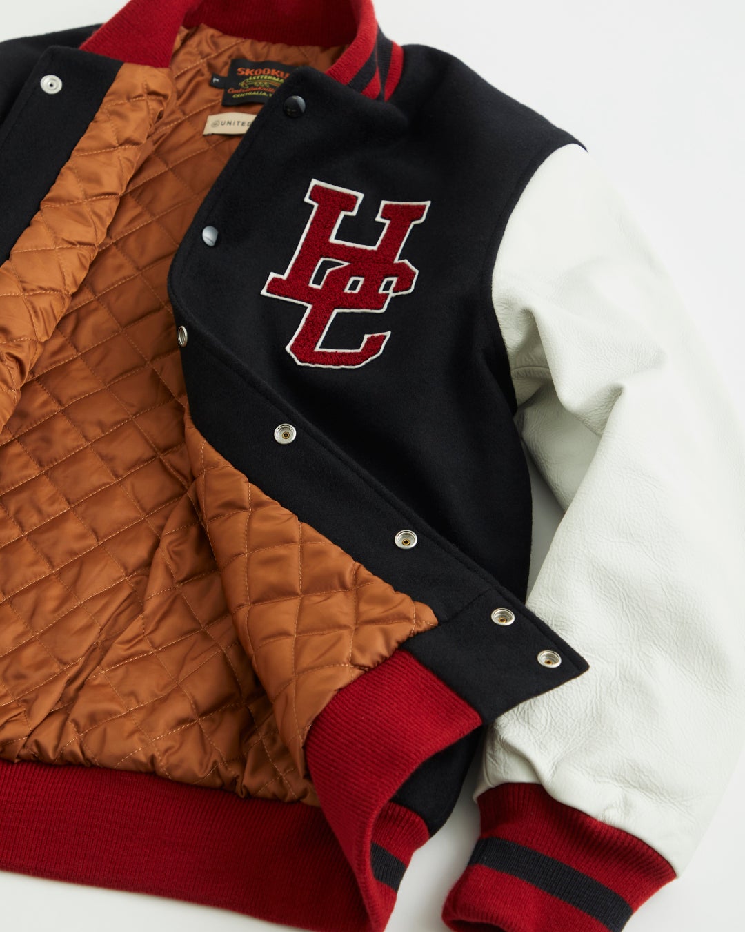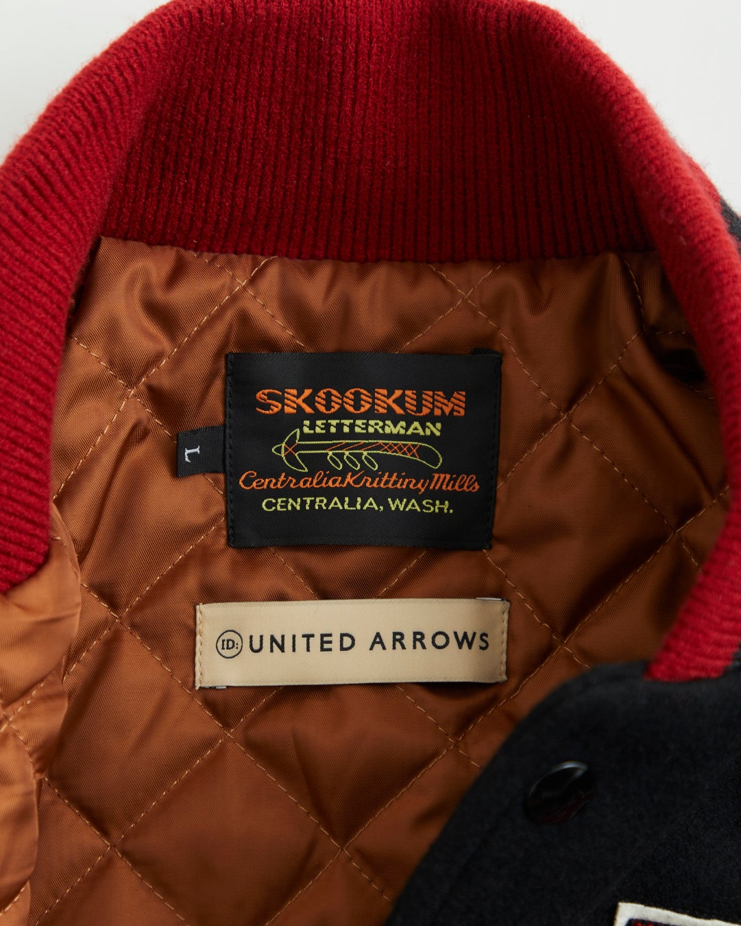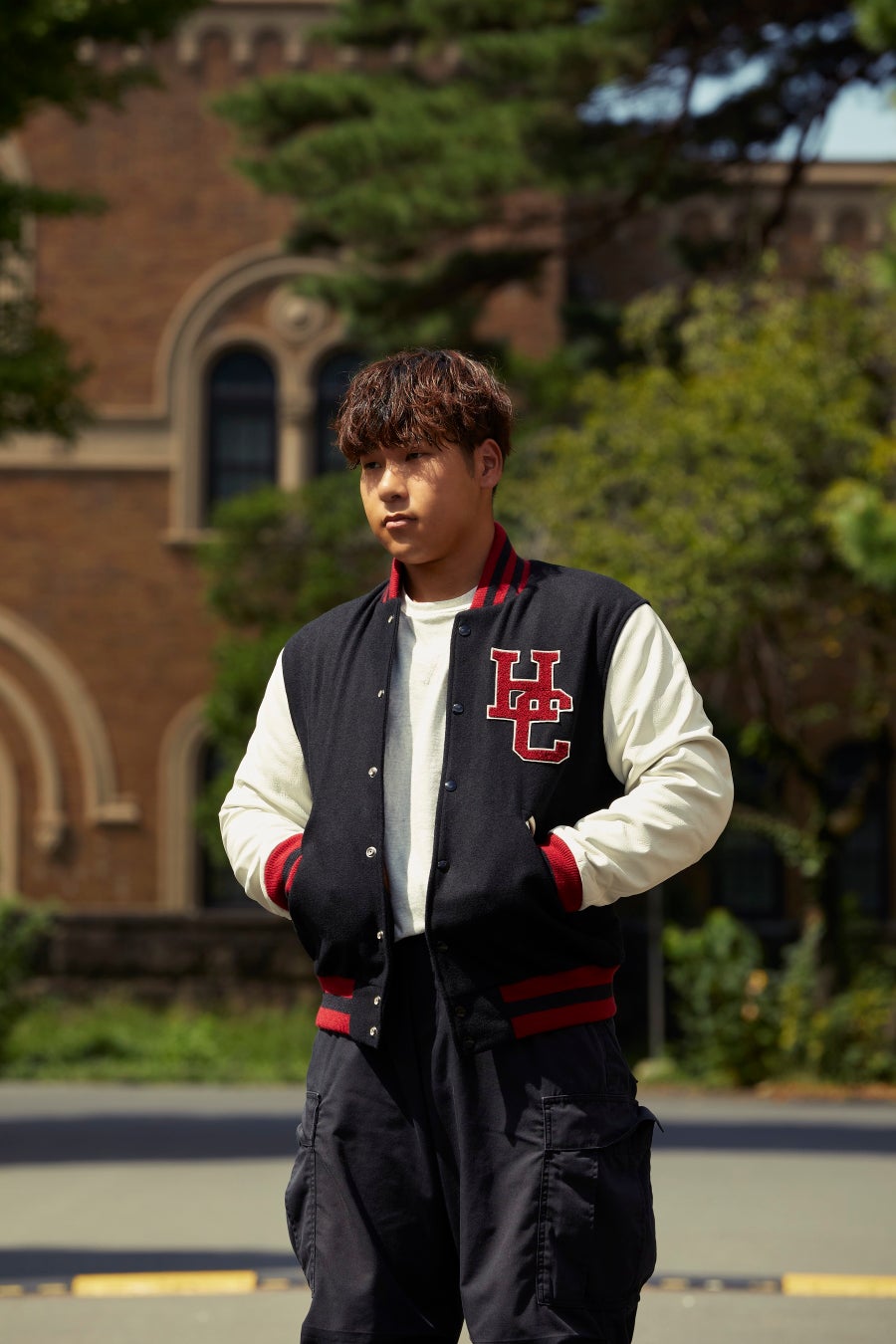 米国・ワシントン州発祥のブランド「Skookum(スクーカム)」とのコラボで、クラシックでトラディショナルな雰囲気が漂うスタジャンです。胸に「HITOTSUBASHI」「CRIMSON」の頭文字を取ったワッペンが、背中には一橋大学のシンボル・兼松講堂のデザイン画のプリントと、「CRIMSON」のロゴの刺繍が入っています。