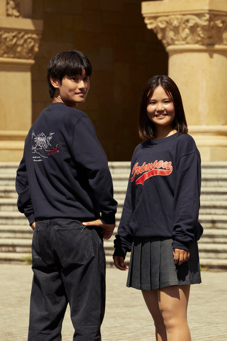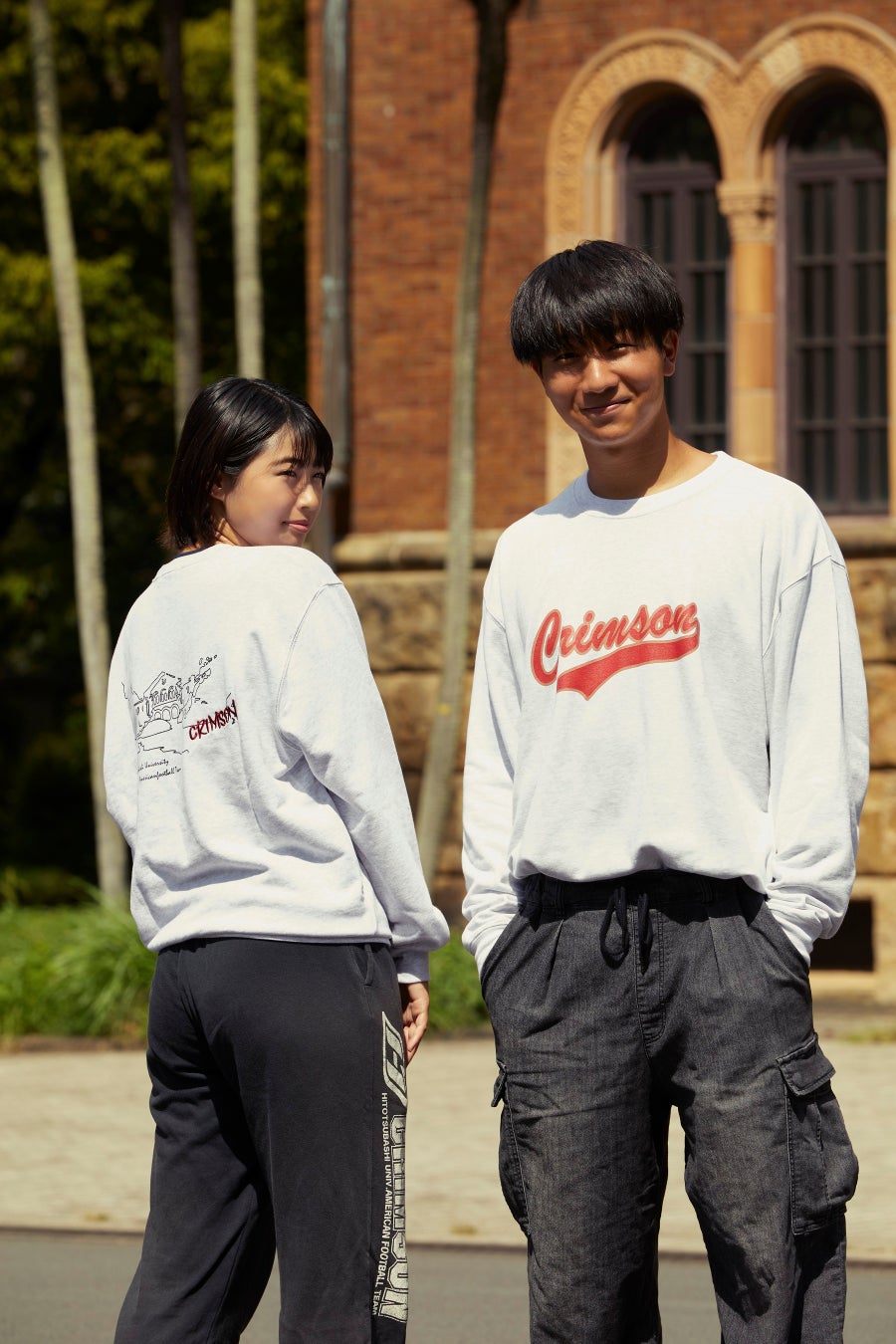 ビンテージのカレッジスウェットに着想を得て、「CRIMSON」のロゴをデザイン化しました。ロゴのカラーは「CRIMSONレッド」でポイントとして縁取りにオレンジを。背中にはスタジアムジャンバーと同じく、兼松講堂のデザイン画のプリントが入ります。女性も着用しやすく、タウンユースとしても取り入れやすい仕様です。アッシュグレー、ネイビーの2色展開。