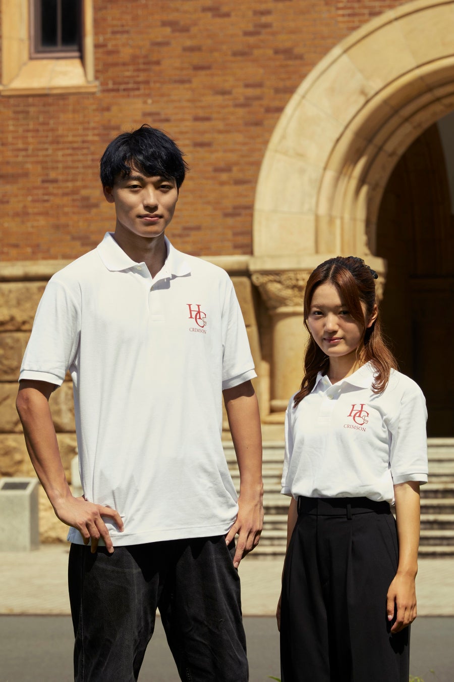 HITOTSUBASHI」「CRIMSON」の頭文字「H」「C」をデザイン化したロゴを胸元に。「C」はヘルメットの形をイメージしました。フォーマルな場にも対応できるデザインで、部員の皆様も公式着として試合会場への移動やセレモニー参加等の場面で着用します。