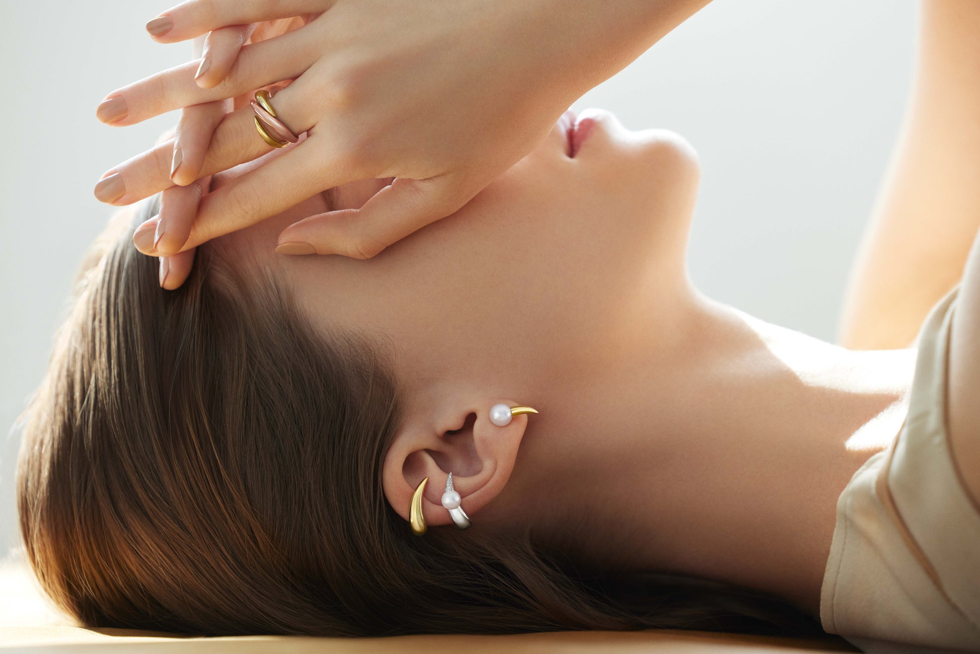 右耳上から)デインジャー ホーン プラス イヤーカフ (右耳用)[18KYG] ¥286,000、デインジャー ホーン プラス ダイヤモンド パヴェ イヤーカフ (右耳用)[18KWG、あこや真珠、ダイヤモンド] ¥363,000、デインジャー ファング イヤリング [18KYG、あこや真珠] ¥247,500(両耳価格)