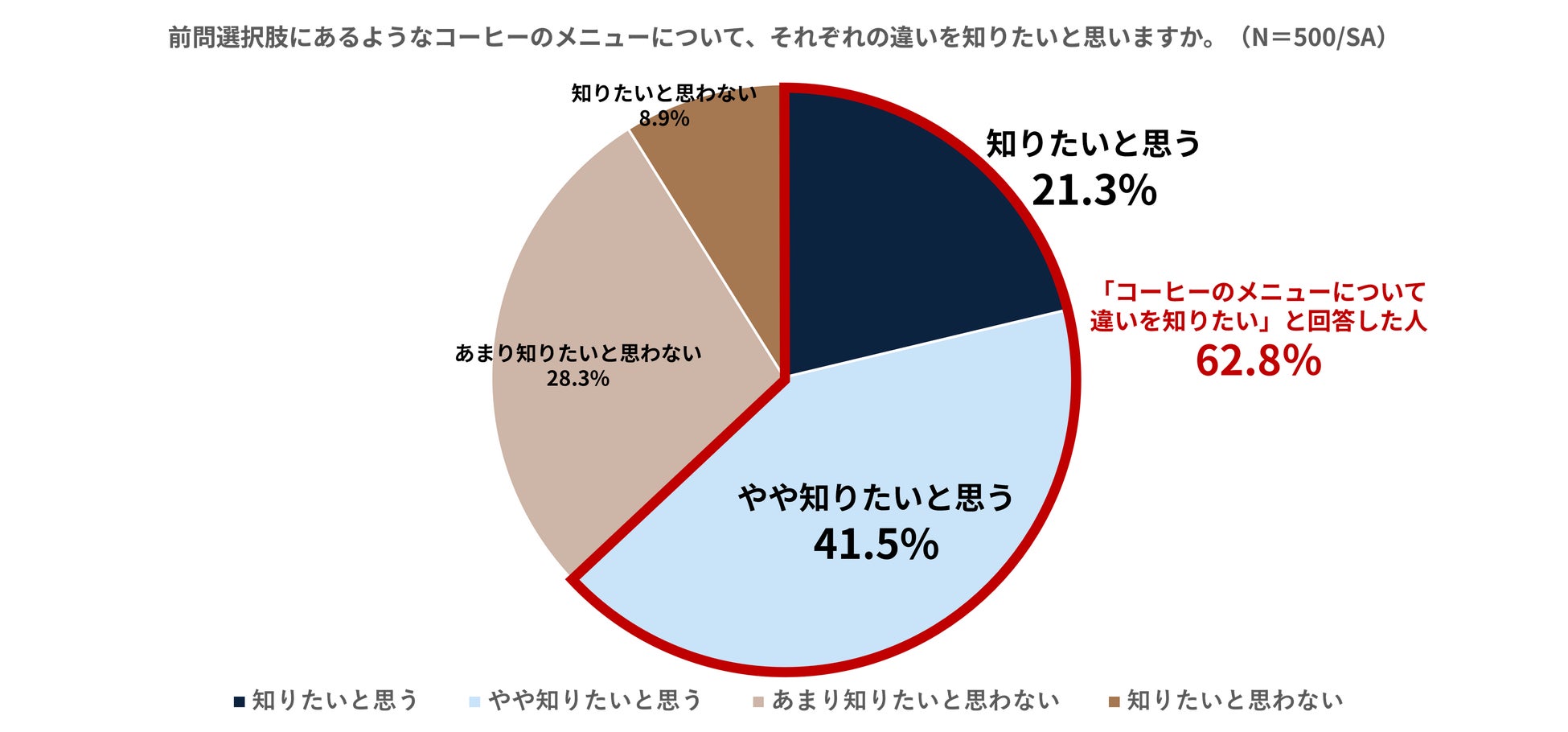 この結果から、約2人に1人がミルク派である一方で、各メニューの違いまで理解している人は少ないことが明らかになりました。そのうえで、コーヒーメニューの違いについて知りたいかを尋ねたところ、「知りたい」「やや知りたい」が合計62.8%となり、多数派を占める結果となりました[グラフ7]。