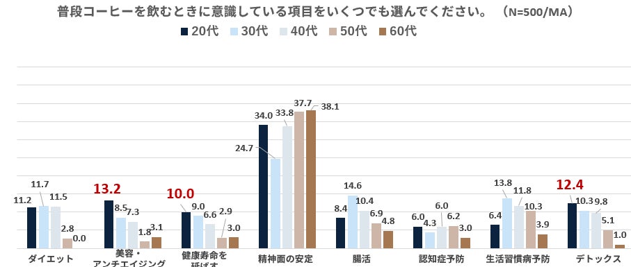 「コーヒーと心身の健康」に関連すると思う要素として、「精神面の安定」(49.3%)、「生活習慣病予防」(22.3%)、「腸活」(18.9%)、「ダイエット」(14.9%)と続き、コーヒーについて健康面への効果を意識していることがうかがえます。また、「美容・アンチエイジング」「デトックス」「健康寿命を伸ばす」の3項目では20代の意識率が最も高く、若い世代ほどコーヒーと健康を結び付けている傾向が見受けられる結果でした[グラフ12]。
