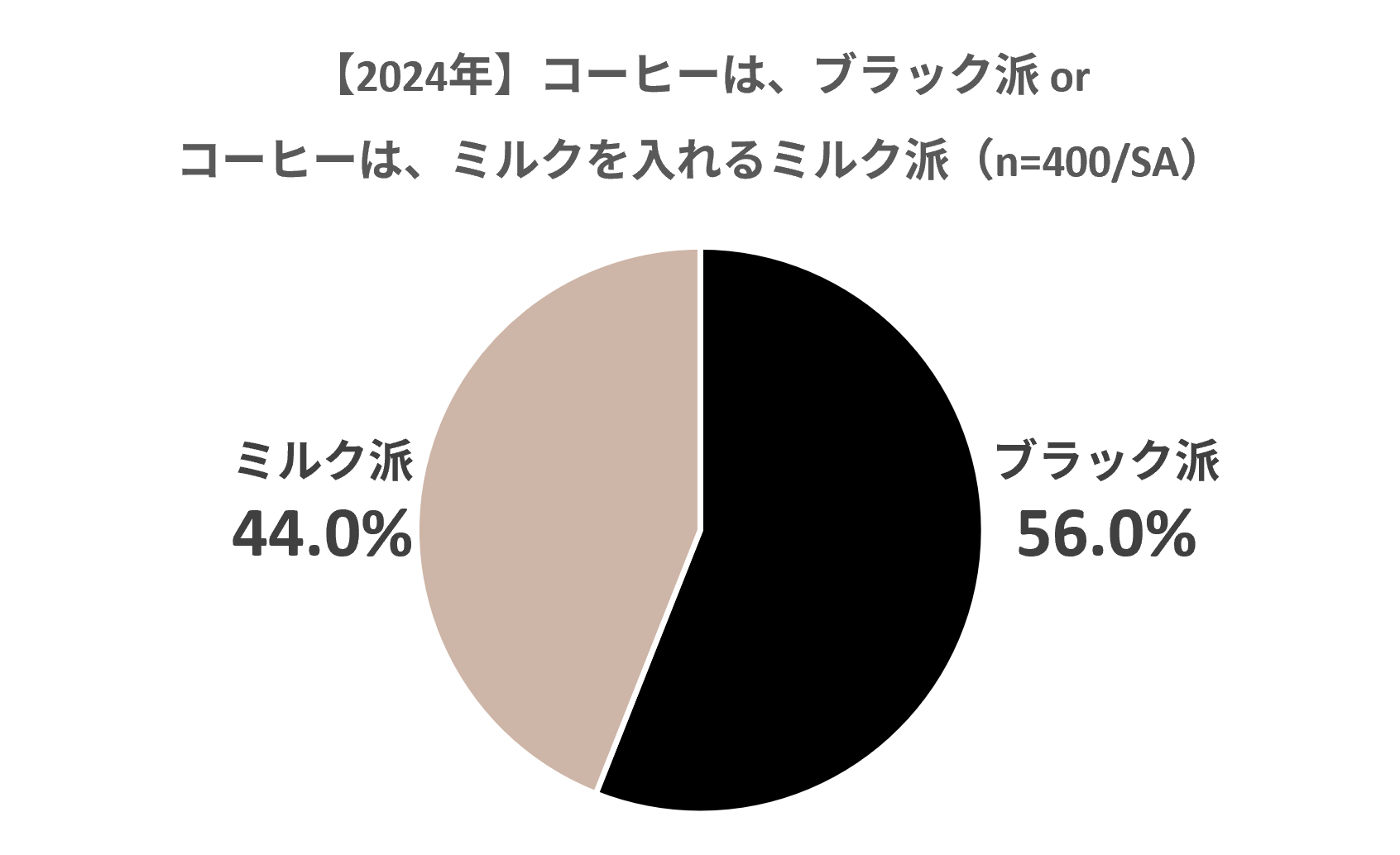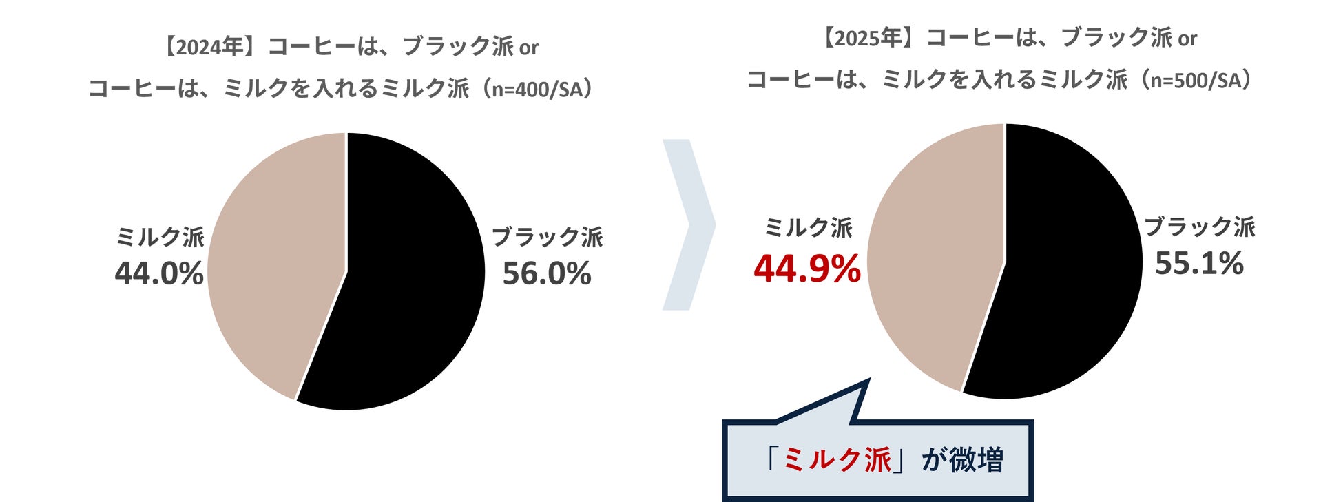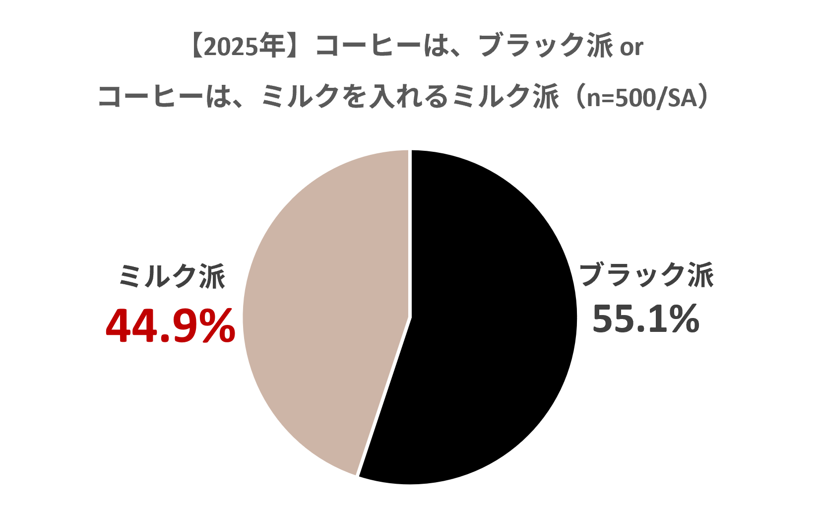 自宅で週に1回以上コーヒーを飲む人に「ブラック派」「ミルク派」のどちらかについて聞くと、「ブラック派」が55.1%、「ミルク派」が44.9%と、おおよそ半数ずつに分かれる結果となりました。昨年の調査結果と比較すると、「ミルク派」の割合は昨年度から0.9ポイント増加しており、微増ではあるものの、ミルクメニュー人気が高まっている傾向が見受けられます[グラフ3, 4]。