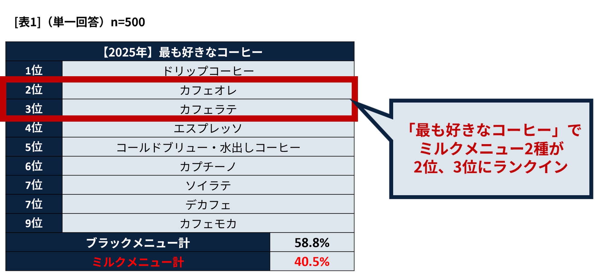 「カフェオレ」「カフェラテ」が2位、3位にランクインし、ミルクメニューの人気も高い傾向に