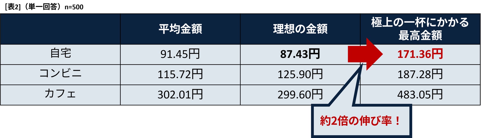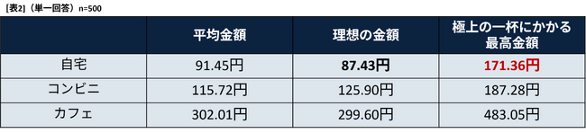 コーヒー1杯にかける金額について聞いたところ、自宅で一杯にかける平均値は91.45円と過去最安に。2024年度の結果からは約67円もの減少となりました。自宅での“理想の金額”はさらに安くしたい意向がある一方で、“極上の一杯にかけたい金額”の伸び率としては、「自宅」「コンビニ」「カフェ」を比較した際に最も高く、「自宅で飲むコーヒー」へのこだわりの高まりを感じさせます[表2]。