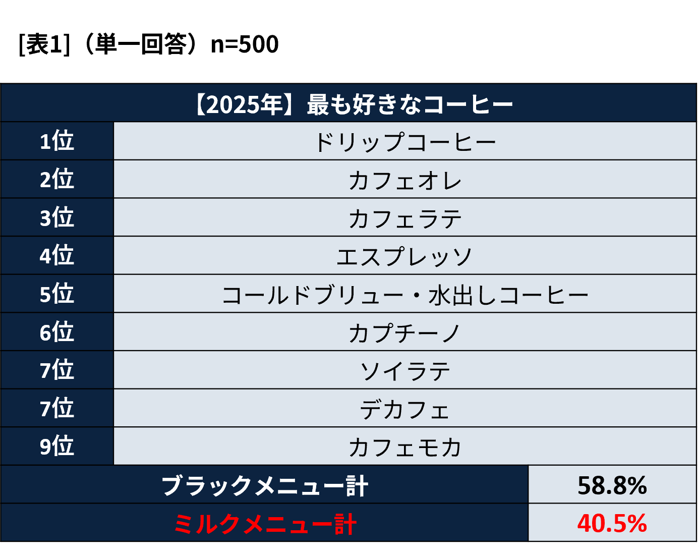 ■最も好きなコーヒーメニュー、引き続き「ドリップコーヒー」「カフェオレ」が首位
