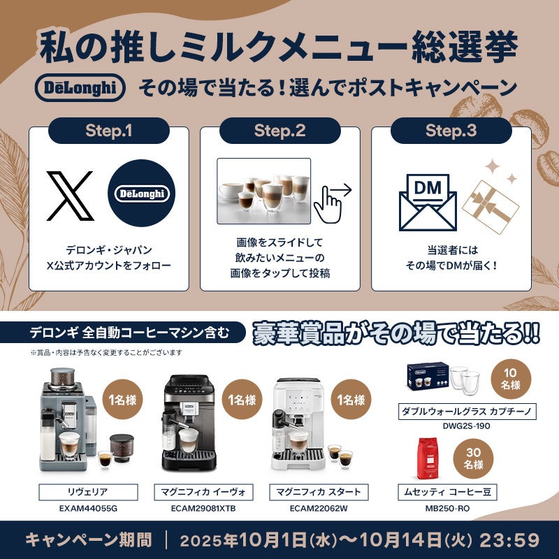 ・キャンペーン内容:X公式アカウント(@DelonghiJapan)をフォローの上、対象投稿から飲みたいミルクメニューのバナーを押下してポストした方から抽選で43名様に、デロンギ全自動コーヒーマシンを含む豪華景品をプレゼント
