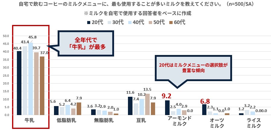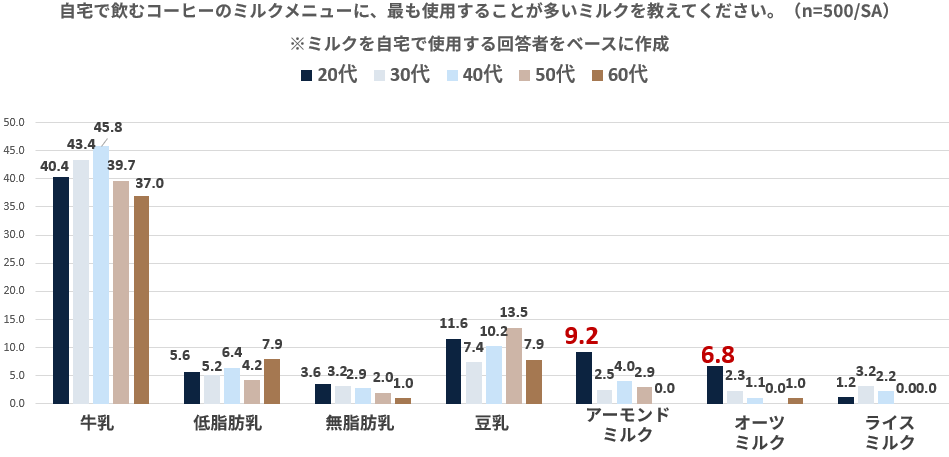 同回答者に、自宅で飲むコーヒーのミルクメニューに使用するミルクの種類について聞いたところ、ミルク使用者の中ではどの年代も「牛乳」が最も高い結果でした。その一方で、20代では9.2%が「アーモンドミルク」、6.8%が「オーツミルク」と、ミルクの種類から選択の幅が広がっていることがわかります[グラフ6]。
