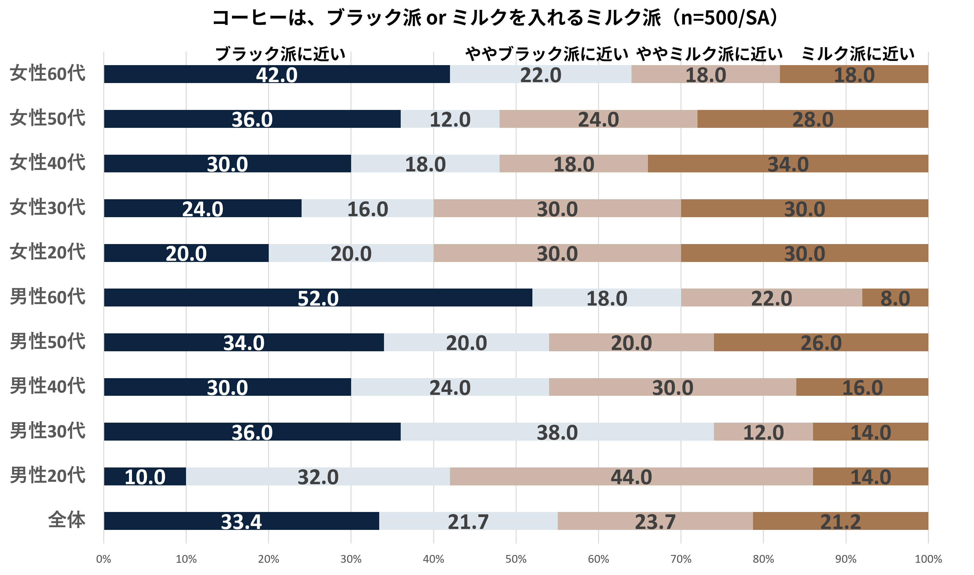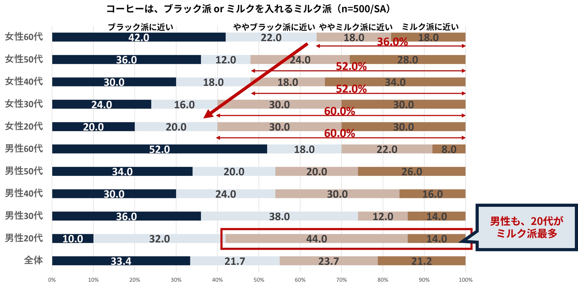 性年代別に見ると、女性は年代が下がるほど「ミルク派」が多くなる傾向があり、男性は20代が最も「ミルク派」が多い結果でした[グラフ5]。