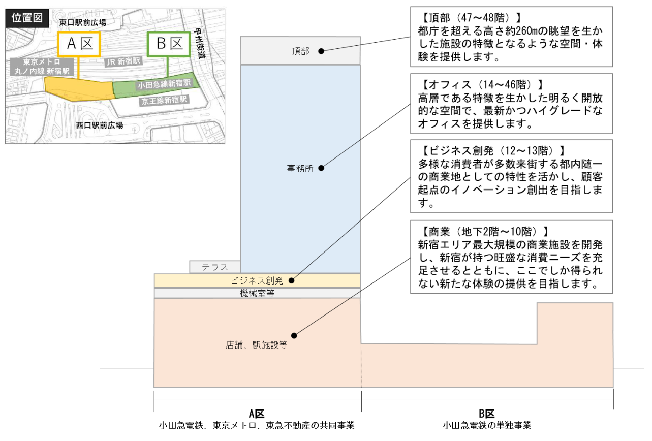 今後は、小田急電鉄、東京メトロ、東急不動産の3社が相互協力することで、世界一のターミナル「新宿駅」をはじめ、日本有数のオフィス街とエンターテインメント性豊かな繁華街という異なる顔を持ち、オフィスワーカーや国内外旅行者、来街者など、さまざまな人が行き交う多様性に富んだ新宿という街において、新たなランドマークを創出してまいります。