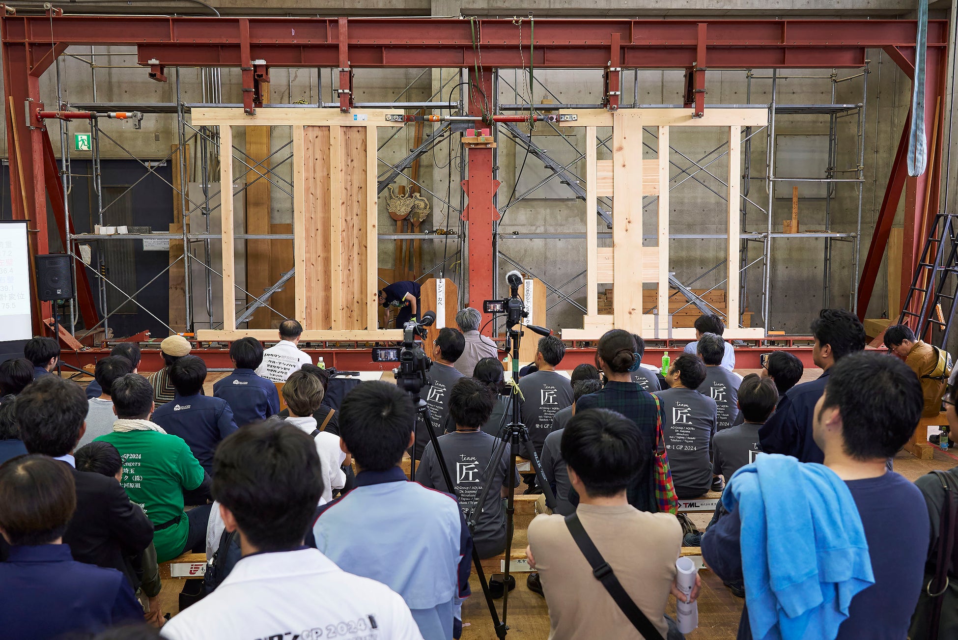 AQチーム匠は稲山氏とタッグを組み、複数回のトーナメント優勝や総合優勝を獲得。昨年は大会史上最大耐力となる71.2kNを記録するなど、カベワンGPの“高い壁”となっています。カベワンGPに出場した多くの学生が卒業後、木造建築技術者として企業などの第一線で活躍しており、「打倒、AQチーム匠」を目指してカベワンGPに参戦するケースもあります。