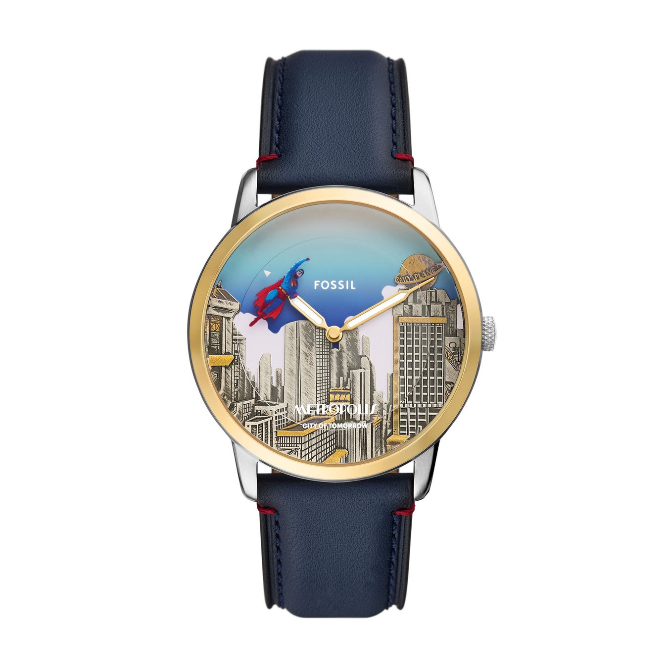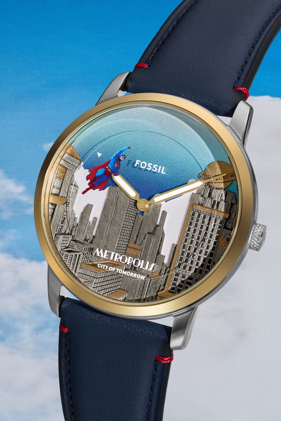 「スーパーマン×フォッシル メトロポリス ウォッチセット」LE1208SET 33,000円(税込)は、立体的なメトロポリスの街並みを表現した複雑なデザインの型押し文字盤が特徴です。 フライング・ポーズをしたスーパーマンをあしらった秒針ディスクが回転することで、時間の経過とともにアイコニックなヒーローが街の上空を舞い上がります。