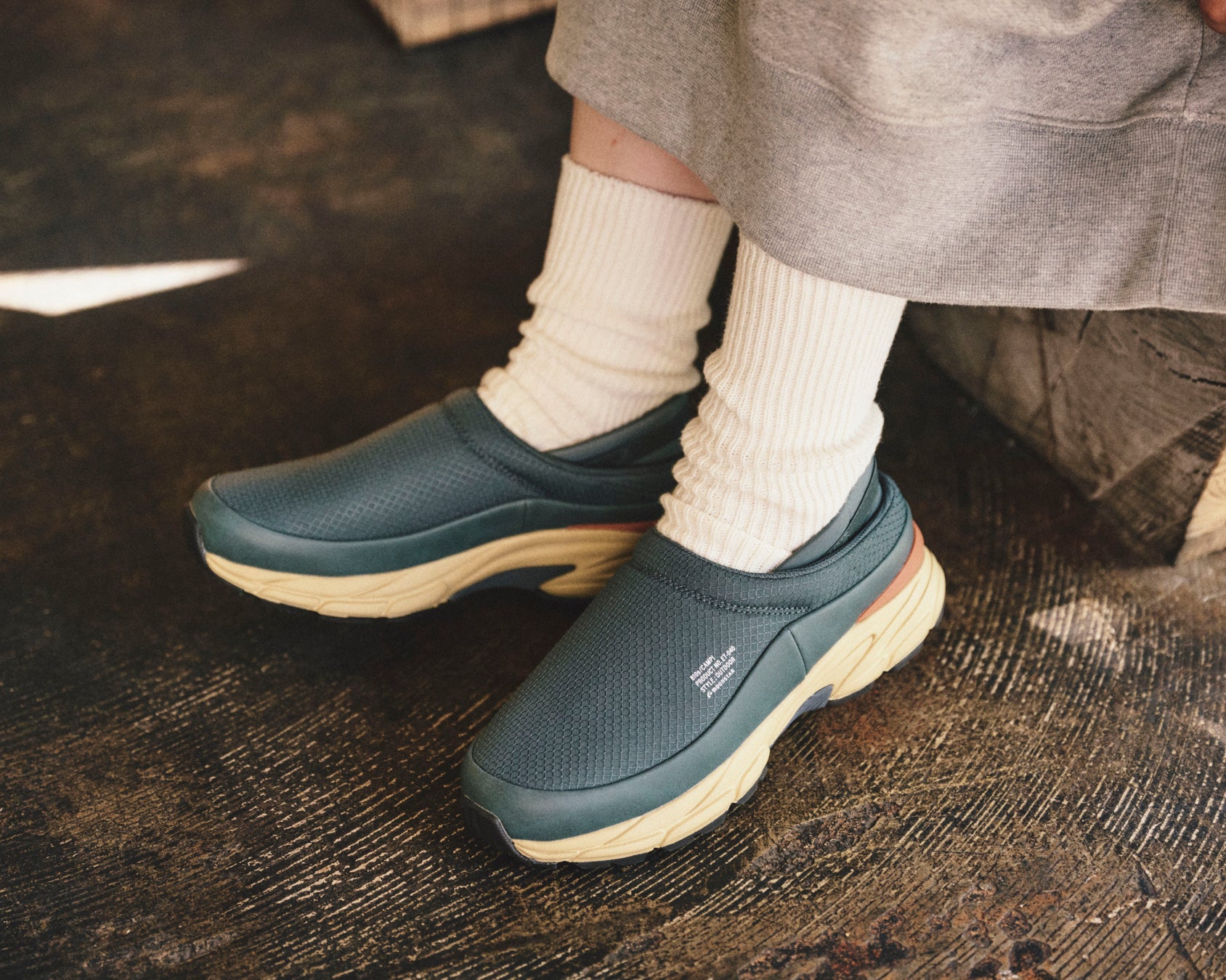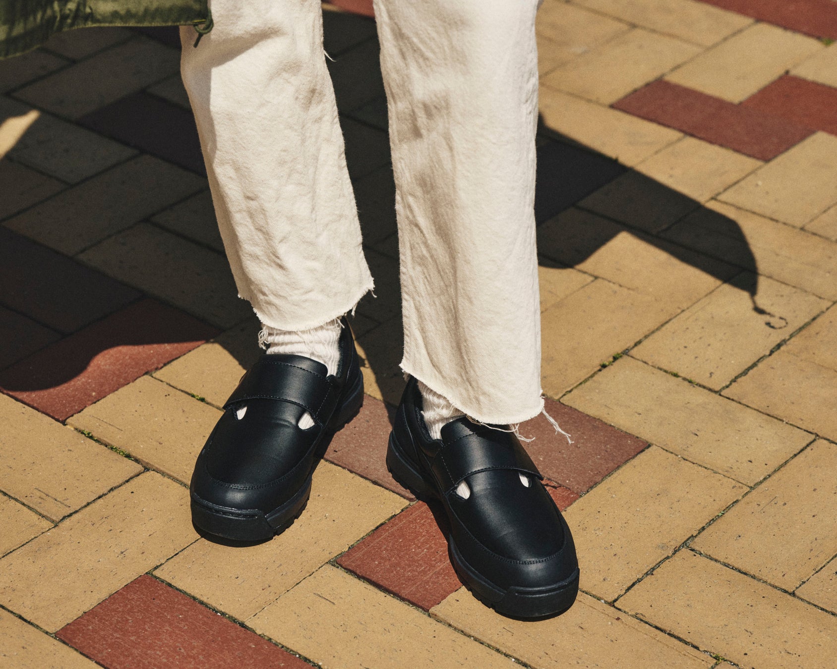 プロユースからデイリーユースに再構築する中で浮かび上がってきた”日々にちょうどいい”といった要素に着目し新しいスタイルを提案。シーズンリミテッドとして展開した《CAMPI》をベースにシルエットを見直しフィット性に優れた構造、防滑ラバーを採用しグリップ力の優れたソールにブラッシュアップ。汚れ易い甲部分をカバーしながら、踵を踏んでも履くことが可能なキックバック仕様のモックタイプ。立ち働くシーンや急な外出など、動きの多い生活の中で快適さを発揮します。プロユースの堅牢さに、日々に馴染む軽やかさを融合させたモックタイプ。使う人の暮らしにそっと寄り添いながら、静かに個性を主張する一足です。