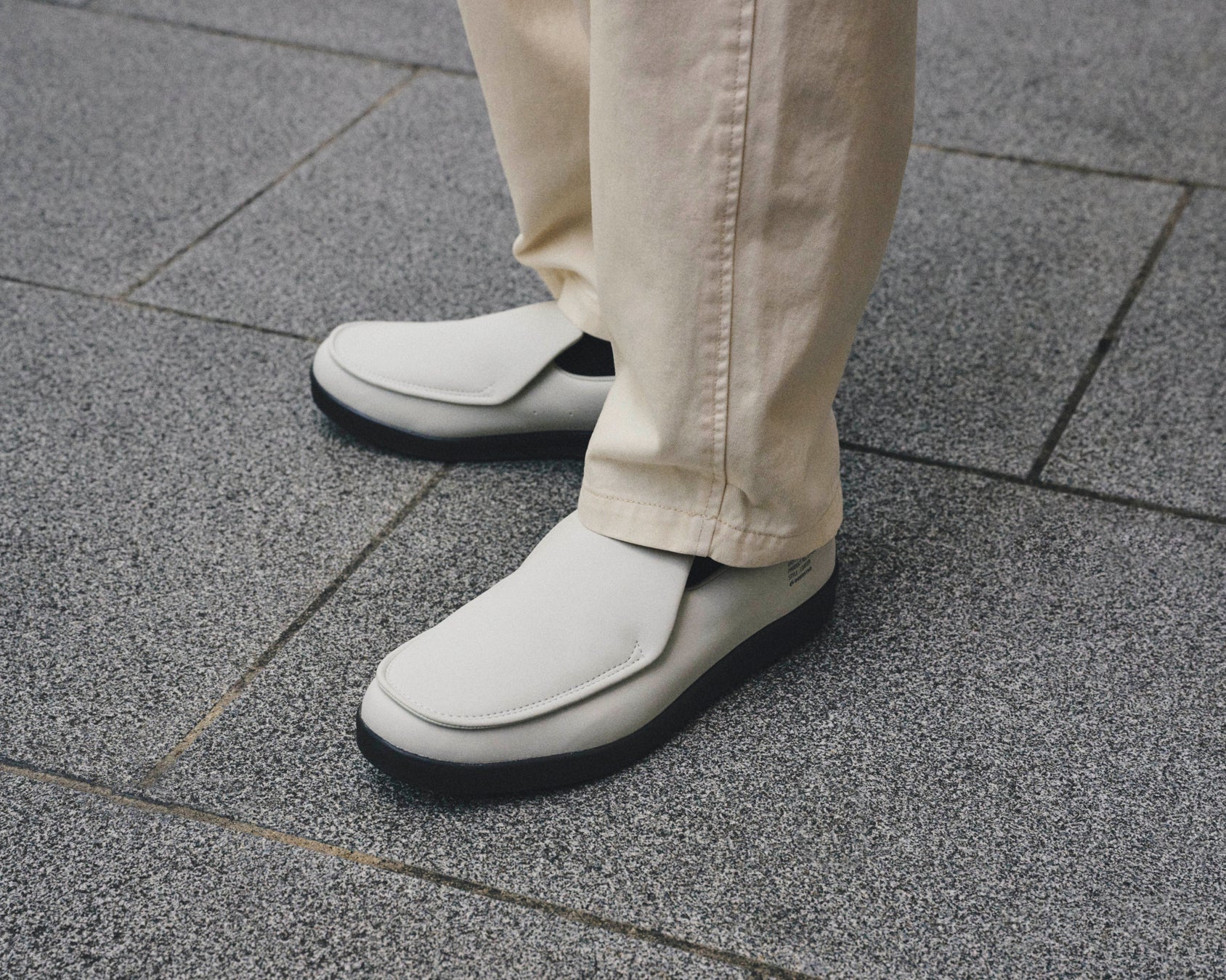 新色のWHITE/BLACKはクリーンで清潔感のあるホワイトが全体を軽やかに見せながら、 ブラックソールがコーディネートに程よい重さと締まりを加えます。 シンプルでミニマルなルックスは、ワークテイストのアイテムはもちろん、モノトーンやナチュラル系のスタイルにも自然に溶け込み、足元にほどよいアクセントを加えてくれます。