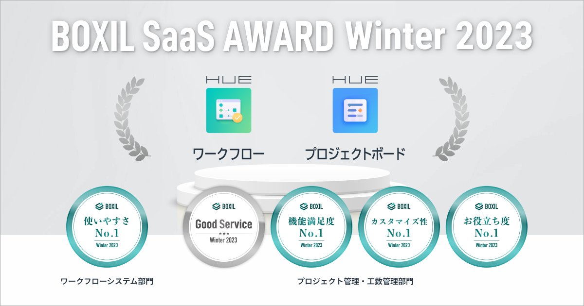 HUEワークフローとHUEプロジェクトボード 「BOXIL SaaS AWARD Winter 2023」の各部門で受賞