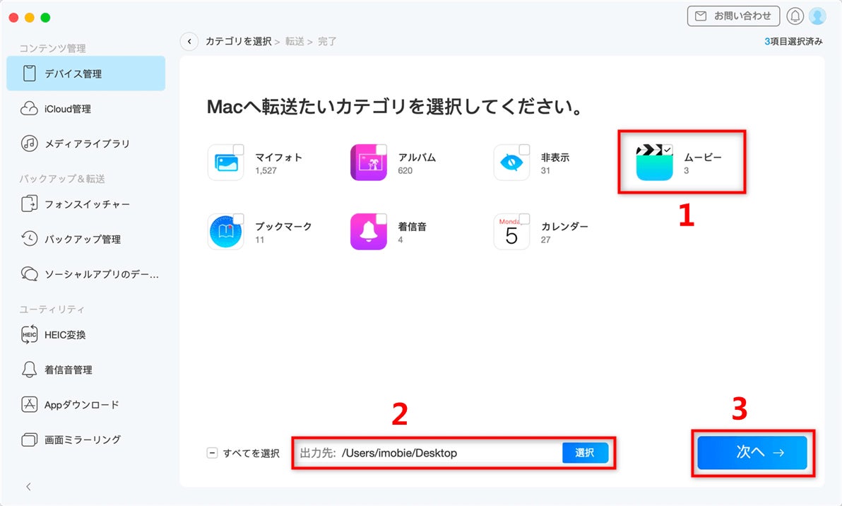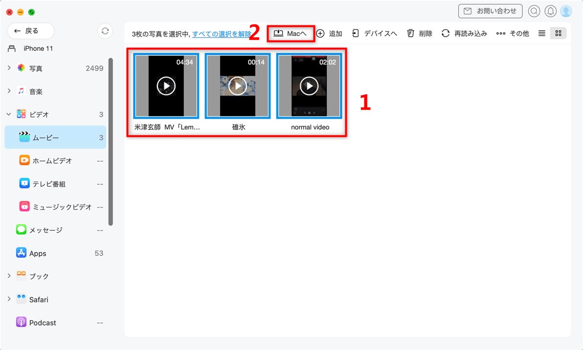 次に、バックアップしたい動画を選んで、右上の「Macへ」ボタンをクリックすれば、iPhoneの動画がパソコンに保存されます。