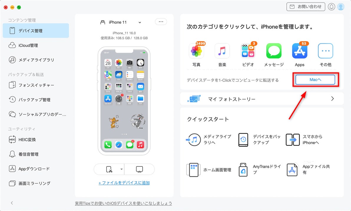 1、PCまたはMacからAnyTransを起動します。右の「Macへ」/「PCへ」ボタンをクリックします。