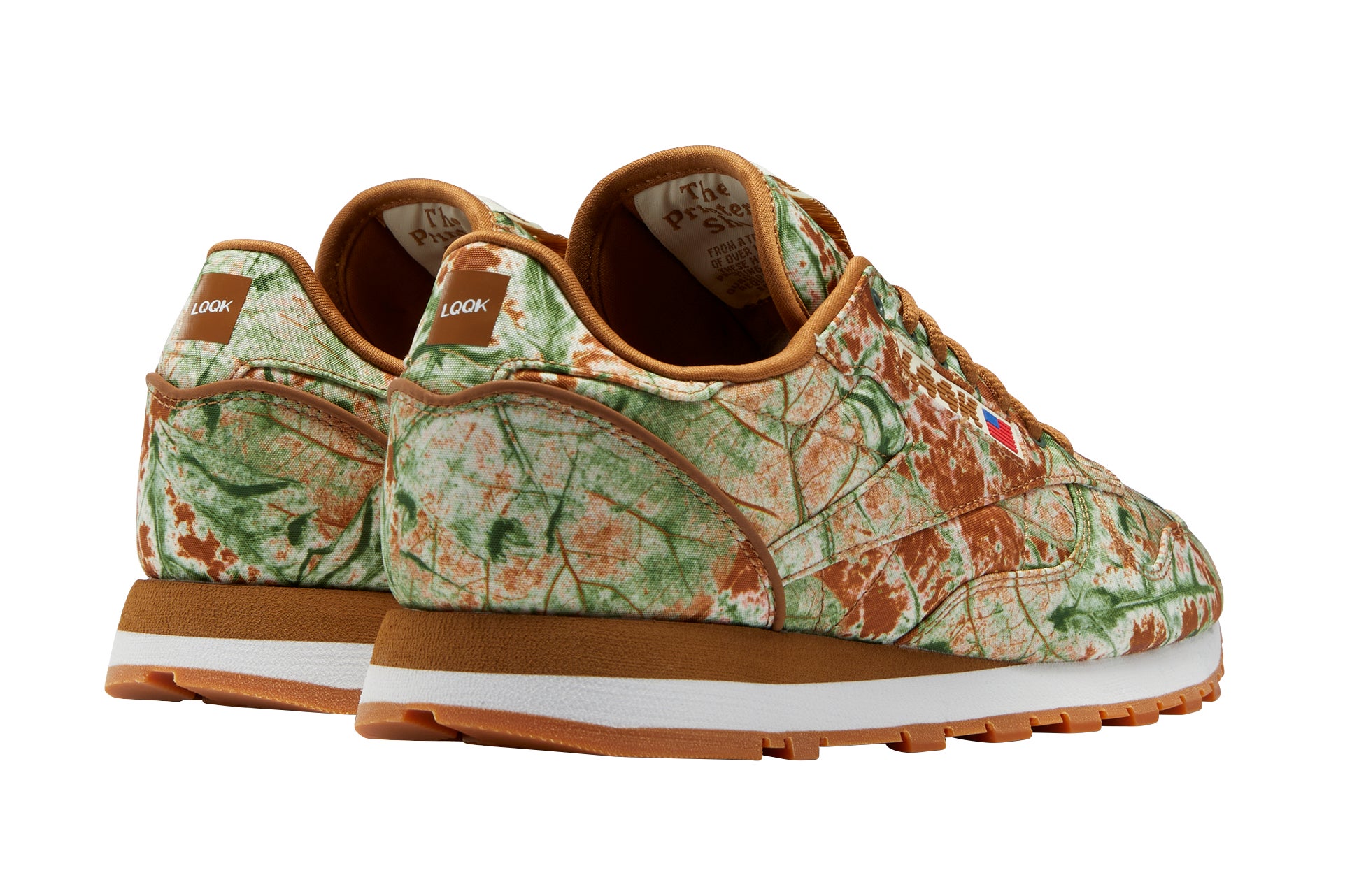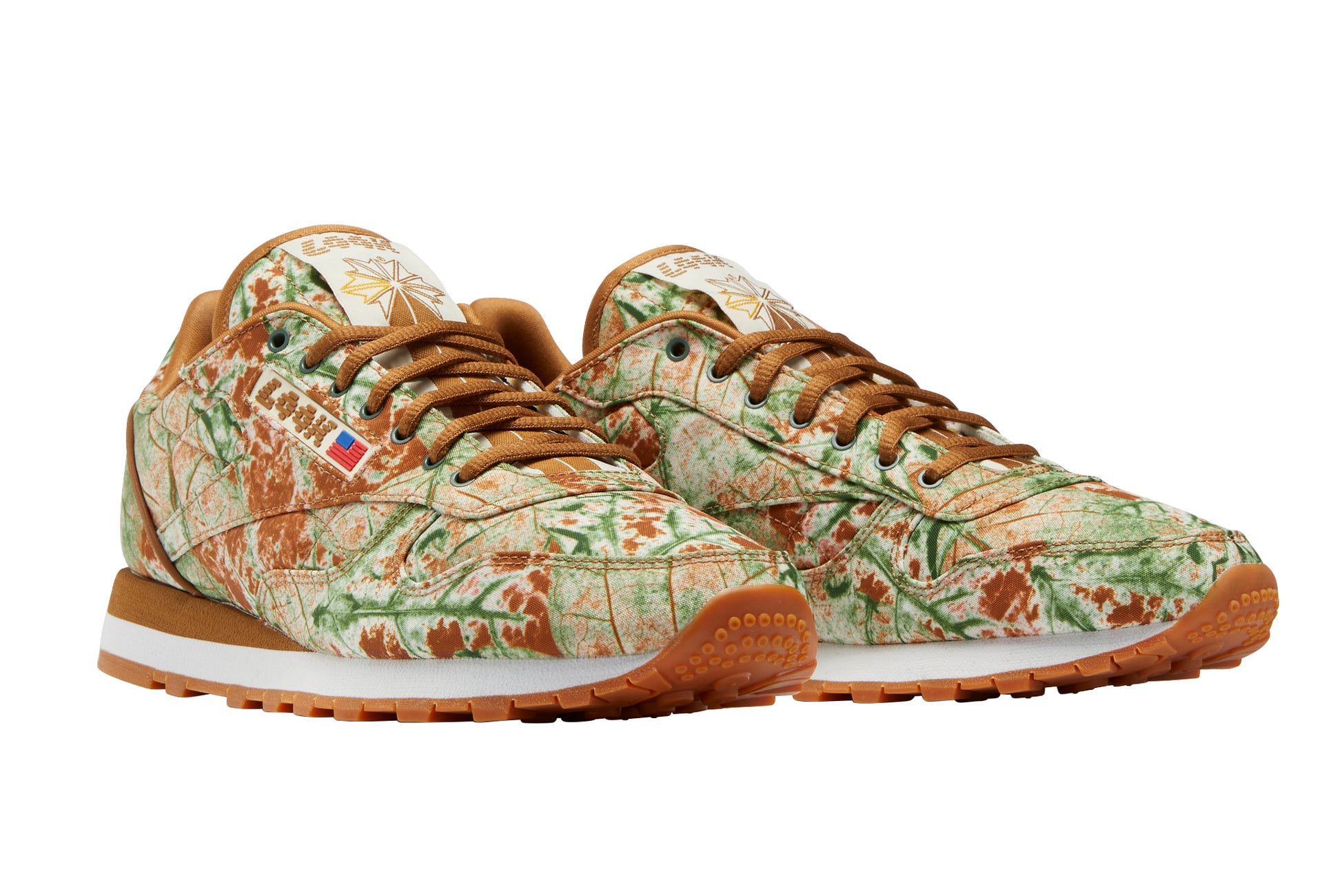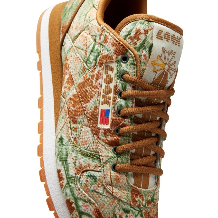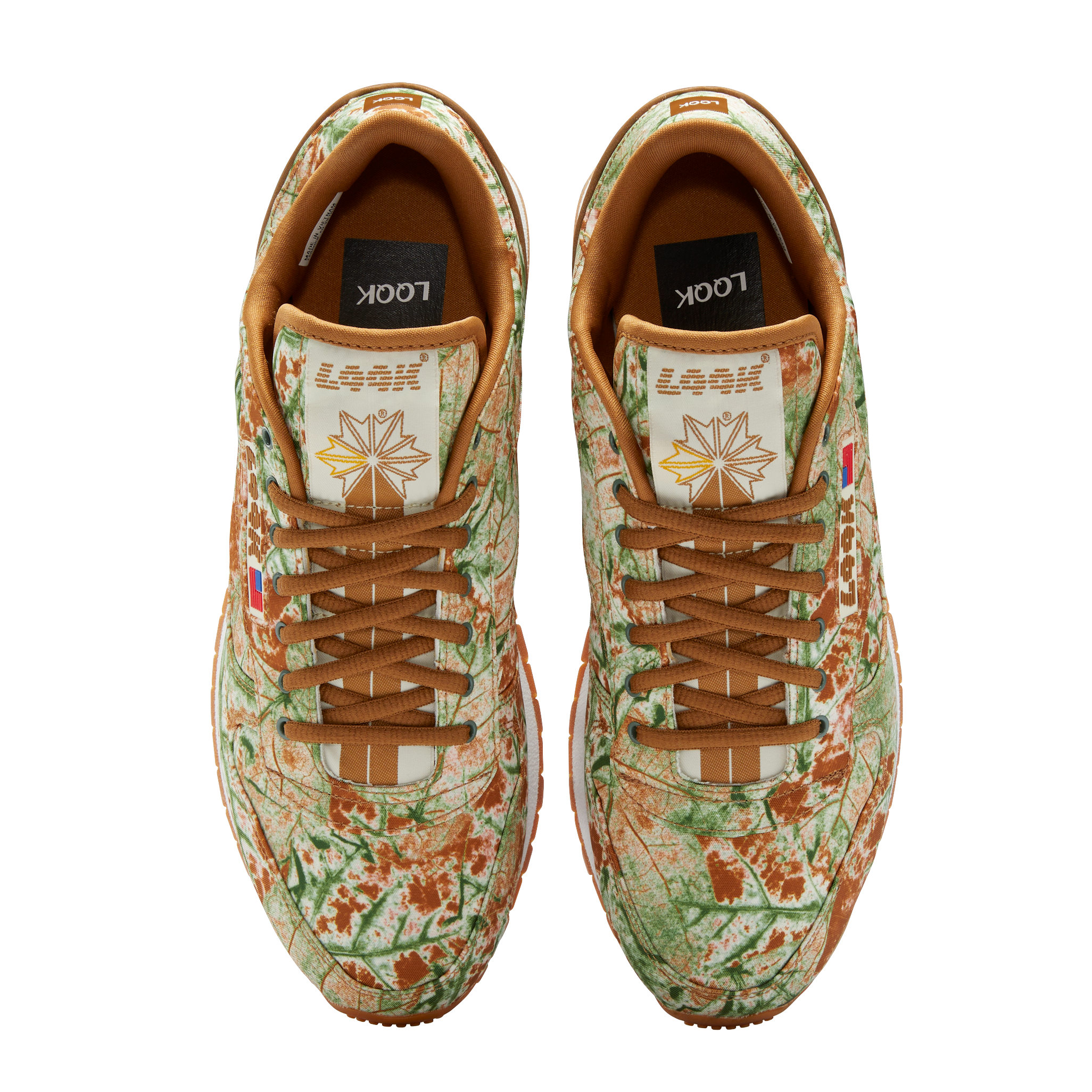 リーフ柄のカモフラージュプリントが満遍なく施された本モデルは、リーボックを形成するストリートカルチャーやアート、ファッションといった深いルーツが、葉脈を辿るように時代を超えて受け継がれ、進化し続けている様子を反映しています。豊かな土壌を表す「バブルガム」カラーと、常に青い葉を茂らす松をイメージした深みのある「パイングリーン」カラーの採用により、細かいプリントデザインでありながらアースカラーのトーンでまとめられた、統一感のあるデザインです。アッパーはテキスタイルアッパー(合成繊維)を使用、シュータンやサイドのウィンドウボックス、ヒール部分には、『LQQK STUDIO』のブランドロゴもあしらわれています。「CLASSIC LEATHER」の定番的なスタイルと斬新なプリントデザインが融合した個性的な一足となっています。