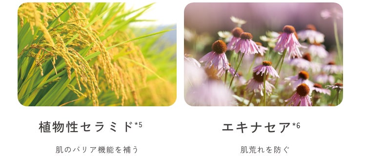 植物性セラミド*⁵で肌のバリア機能をサポートし、エキナセア*⁶ で肌荒れを防ぎます。夏の隠れ乾燥が引き起こす肌荒れを予防しうるおい素肌に導きます。