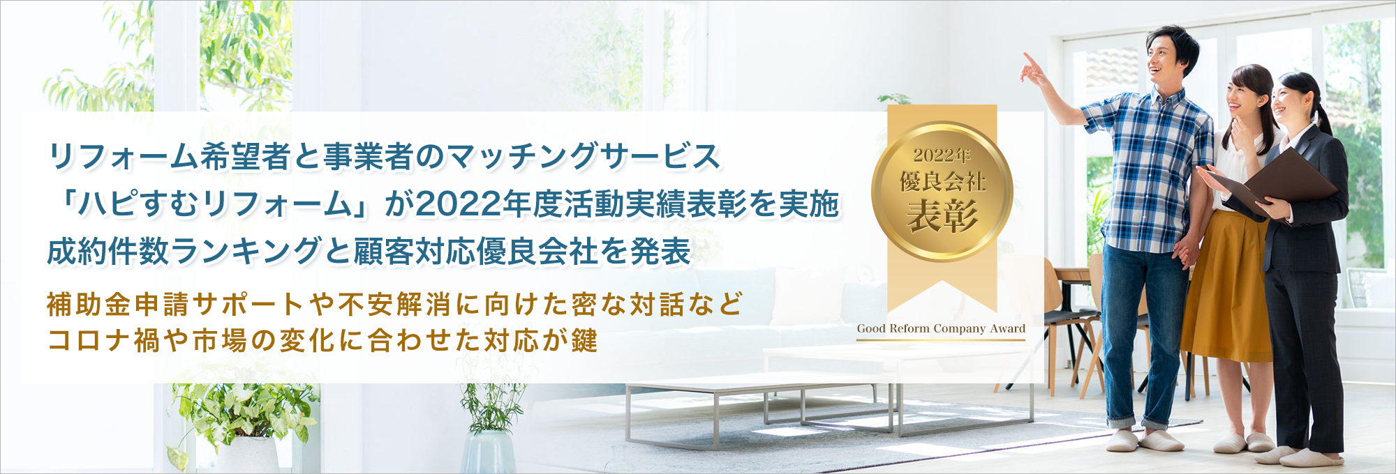 リフォーム希望者と事業者のマッチングサービス「ハピすむリフォーム」が2022年度活動実績表彰を実施。成約件数ランキングと顧客対応優良会社を発表