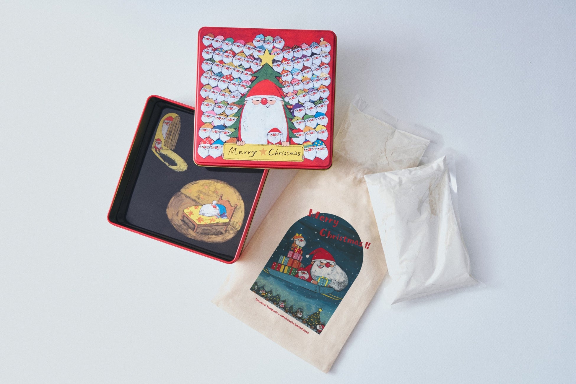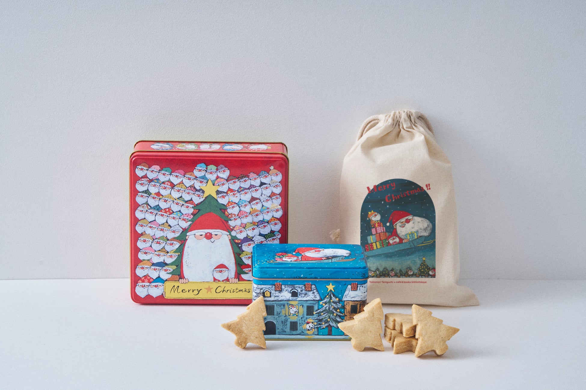 店頭では、谷口智則さんとコラボしたクリスマスグッズも発売いたします。絵本のようなクリスマス缶の中には、絵本から飛び出したようなクッキーや、おうちで作れるビブリオテークオリジナルのパンケーキミックスをセット。「自分が思い描くサンタ像はどんなイメージだったかな」と想像するのが楽しくなるクリスマス特別限定缶です。お子さまや友人など、気軽に渡したいプレゼントやちょっとしたお土産にもおすすめです。