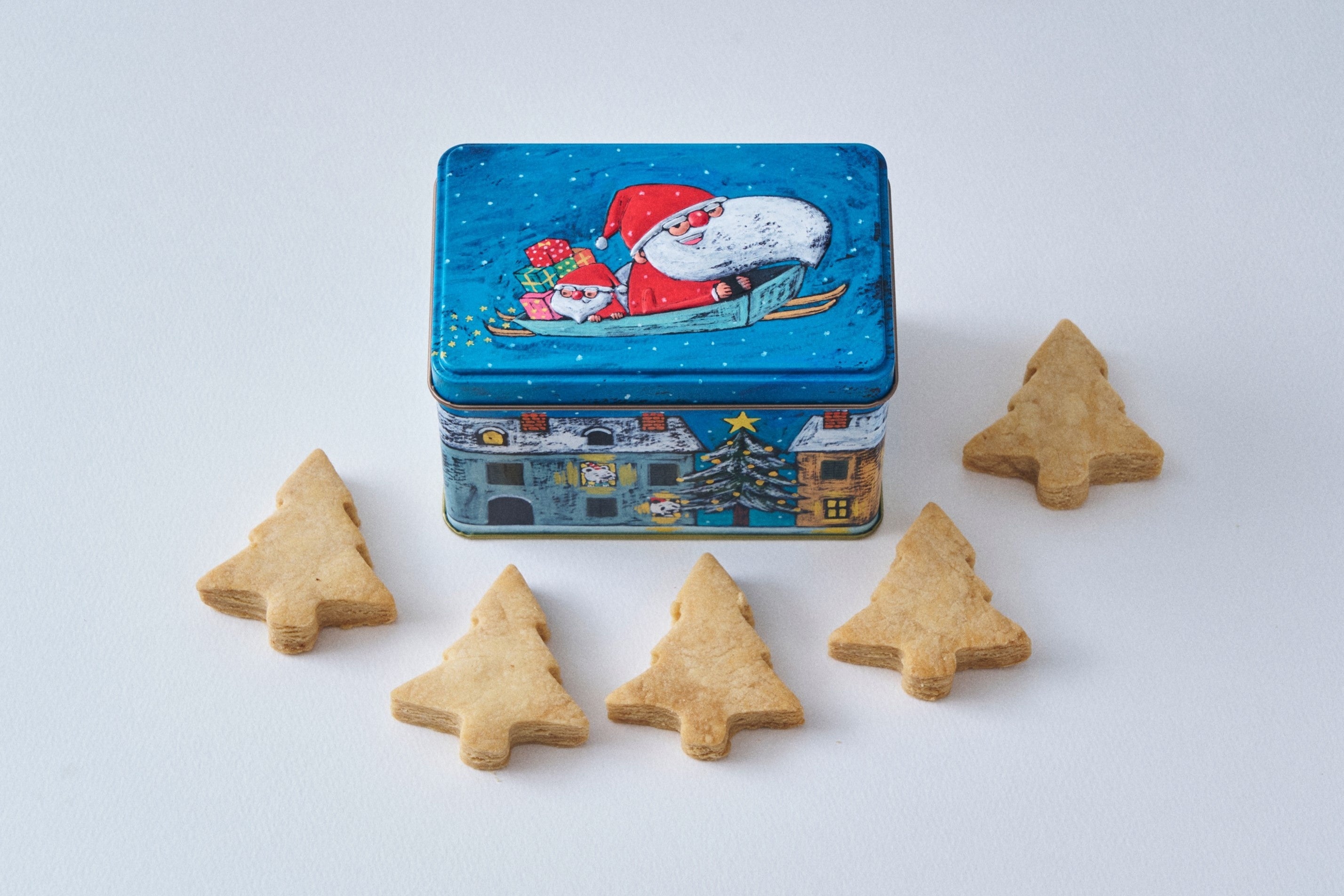 クリスマスの夜...“おおきいサンタ”と“ちいさいサンタ”がプレゼントを配る様子が描かれた缶のなかには、サクサク・ほろほろとした食感のショートブレッドが入っています。クリスマスギフトにもぴったりの商品です。