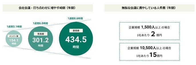 原因のひとつとしては「労働時間の長さ」が挙げられます。中でも会議時間の占める割合は多く、パーソル総合研究所の調査(*2)によると、部長クラスの社員はメンバー層と比較すると、1週間で5.5時間も社内会議の時間が多いことが明らかになっています。さらに約30%の会議を不要と感じていることも判明しています。 これらを人件費で算出すると、企業規模1,500人以上では1社あたり2億円、10,500人以上の会社では年間15億円が不要な会議時間に充てられていることになり、会議の在り方を改めて検討する必要があるといえます。