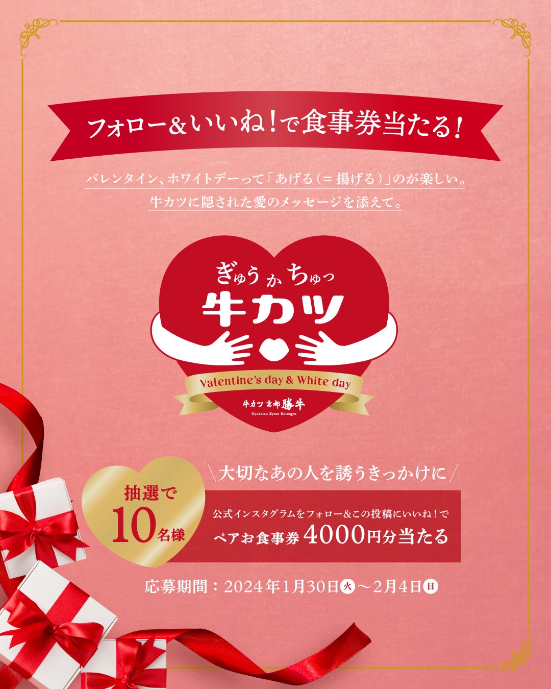 株式会社ゴリップ(本社:京都府京都市)が展開する「牛カツ京都勝牛」は、2024年2月1日(木)~3月14日(木)までの期間限定で、ブランド初のバレンタイン&ホワイトデーフェアを実施致します。