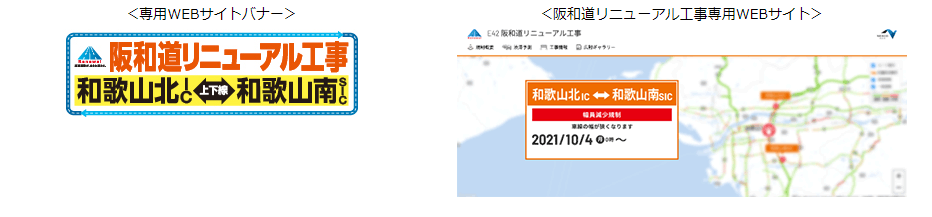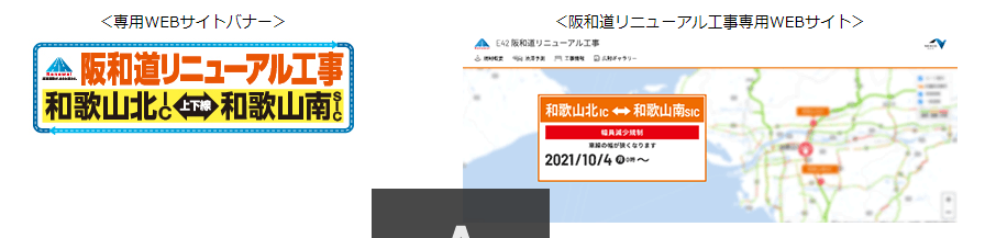 ・「阪和道リニューアル工事 | NEXCO西日本 公式サイト(https://kansai-renewal.com/2021_hanwa/)」において、交通状況やリアルタイムの所要時間、工事内容、工事進捗などを提供してまいりますので、お出かけの際は、最新情報をご確認のうえ、ご利用時間の変更などにご協力ください。