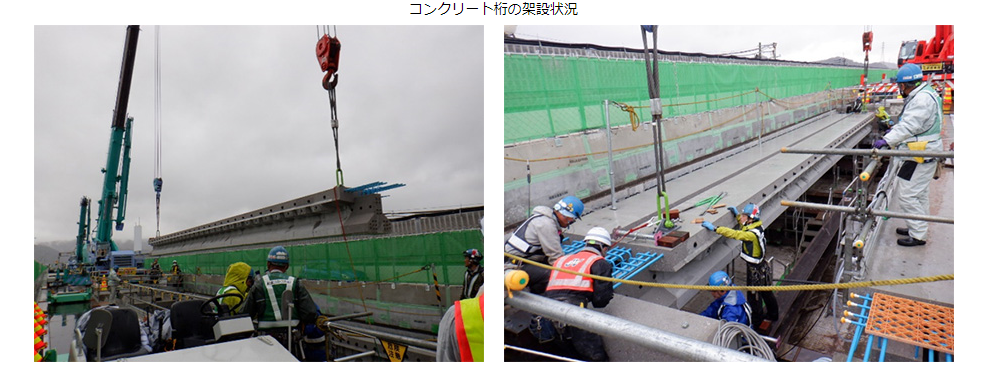 工場で製作したコンクリート桁の部材を、大型クレーンで吊り上げて架設を行いました。