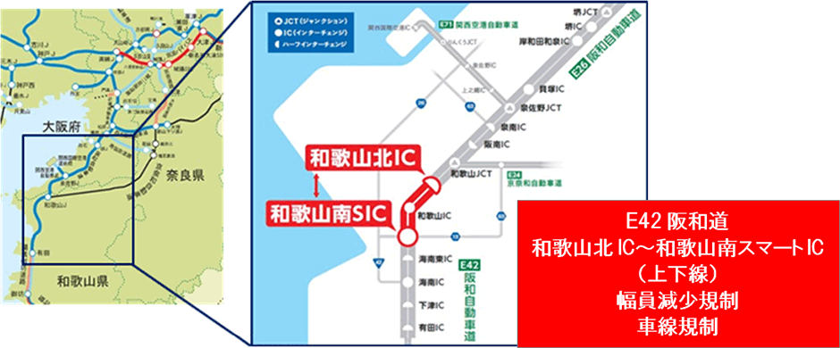 E42阪和自動車道リニューアル工事 和歌山北IC~和歌山南スマートIC間の幅員減少規制を通年実施に変更します