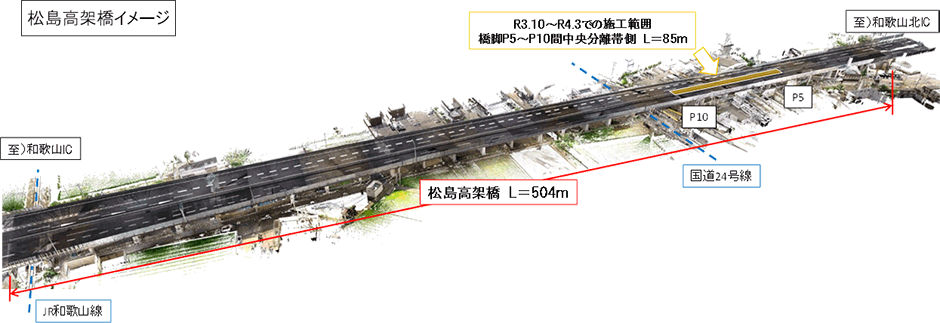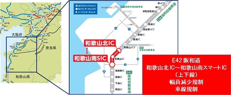 NEXCO西日本関西支社(大阪府茨木市、支社長:永田 順宏)は、高速道路リニューアルプロジェクトとして、E42阪和自動車道(E42阪和道) 和歌山北インターチェンジ(IC)~和歌山南スマートIC間において損傷した橋の架け替えのため、令和3年10月4日(月曜)から車線幅員を減少する幅員減少規制を実施しています。