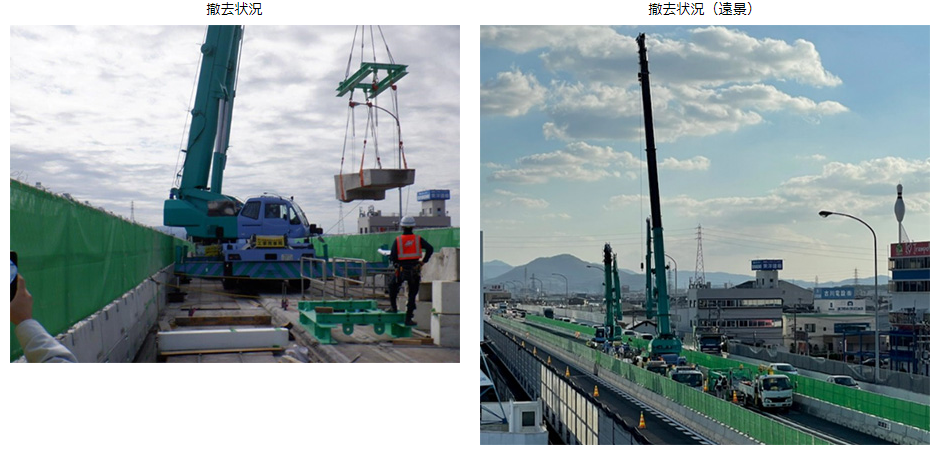 既設のコンクリート主版をワイヤーソー等で切断し、大型クレーンで吊り上げて撤去を行いました。作業内容と交通状況に応じて、車線規制を行い、通行する車両の安全を確保しています。