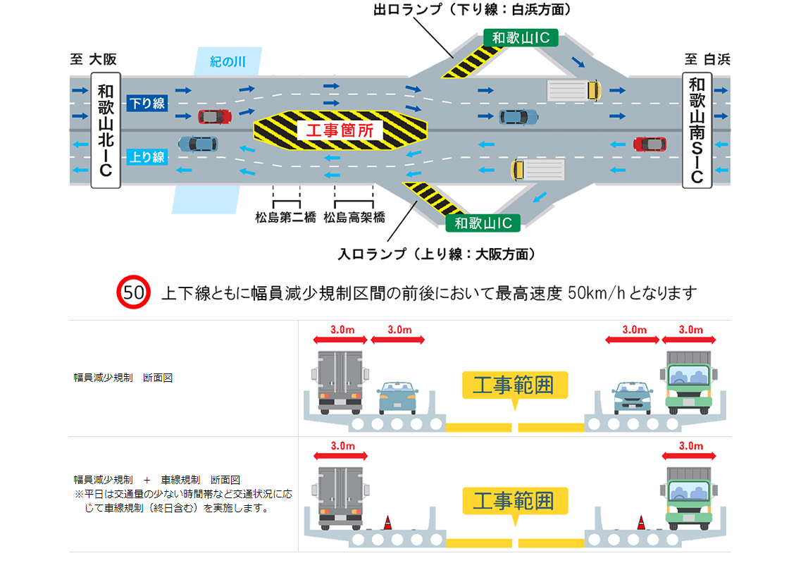 和歌山北IC~和歌山南スマートIC間の本線部の幅員減少規制および和歌山IC出入口ランプの終日車線規制を継続して実施します。本線部で4車線の通行帯は確保しますが、車線幅員を減少し最高速度が50km/hとなりますので、速度や車間距離に注意して安全なご通行をお願いします。また、平日は交通量の少ない時間帯など交通状況に応じて、幅員減少規制に加えて車線規制を実施します。なお、工事の進捗に伴い、本線部の幅員減少規制・和歌山IC出入口ランプでの終日車線規制の規制形態を一部変更することがあります。