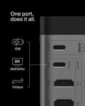 本製品は、従来の大型電源アダプターを本体に内蔵し、150Wの高出力を実現。発熱を抑制しながら、デスク周りをすっきりと整理できる画期的な設計です。GaNテクノロジー搭載によってより迅速かつ効率的な充電を実現し、即座に利用できる強力なパワーハウスとして機能します。11個のポートを搭載し、電力供給、データ転送、microSD/SDカードスロット、ストレージ、映像や音声イーサネットまでマルチメディアへの接続が可能。映像出力、充電、データ転送も対応できる多機能USB-Cポート1つとHDMI 2.0ポート2つ。ディスプレイ1台で最大8K@30Hz、最大3台のモニター4K@60Hzを接続できるため(Windows OSの場合)、クリエイターにも最適で、コンパクトなデザインにより、作業環境を整えやすくなります。内蔵コードを使用して11個のポートを簡単に活用でき、かさばる電源アダプターを持ち運ぶ必要がありません。