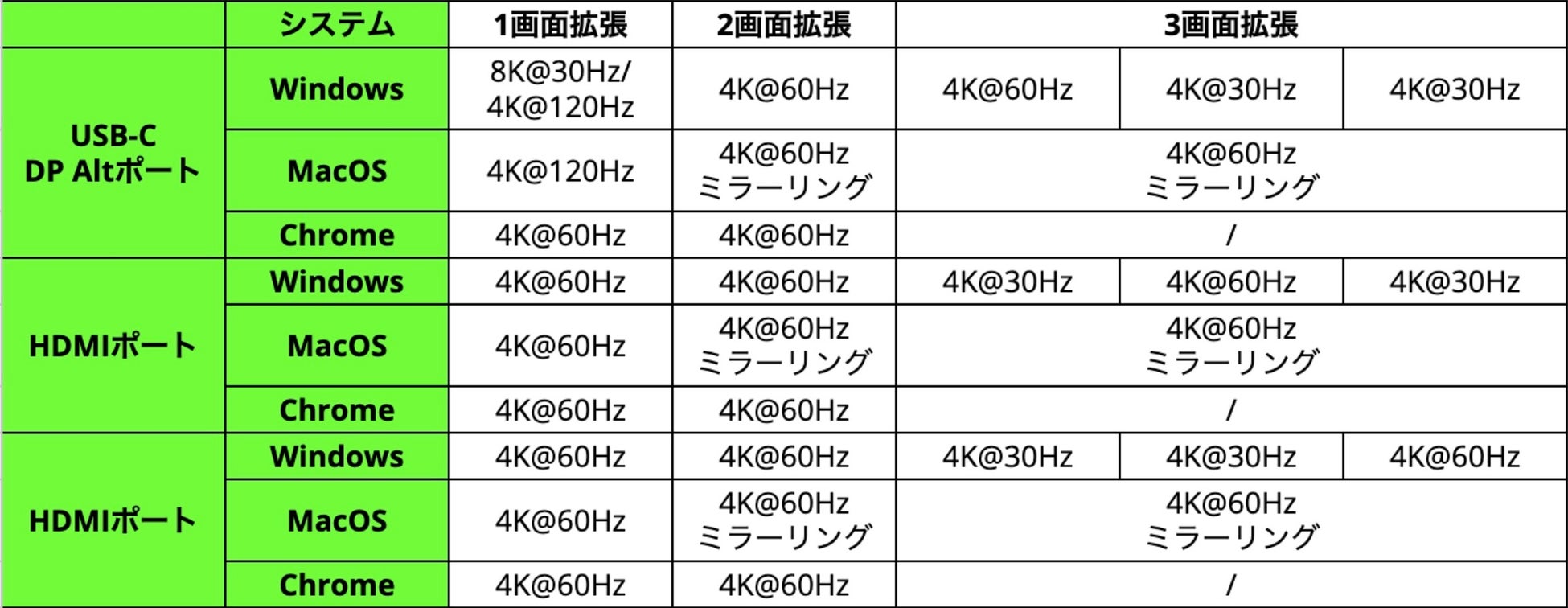 映像出力対応のUSB-Cポート1つとHDMI 2.0ポート2つ。ディスプレイ1台で最大8K@30Hz、2台で最大4K@60Hz、3台で最大4K@60Hzをサポート