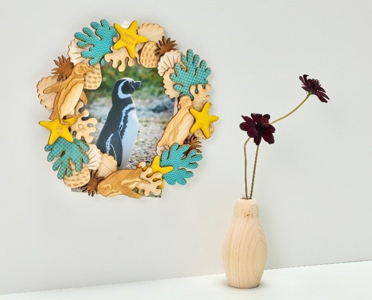 木製リース組み立てキットは、国産のヒノキ、ケヤキ、スギが香るパーツをご自身で組み合わせて手作りしていただくアイテムです。可愛らしいペンギン(マゼランペンギン)のモチーフがアクセント。完成したリースは、お好きな写真やポストカードを飾ることができるフォトフレームとしてもお使いいただけます。