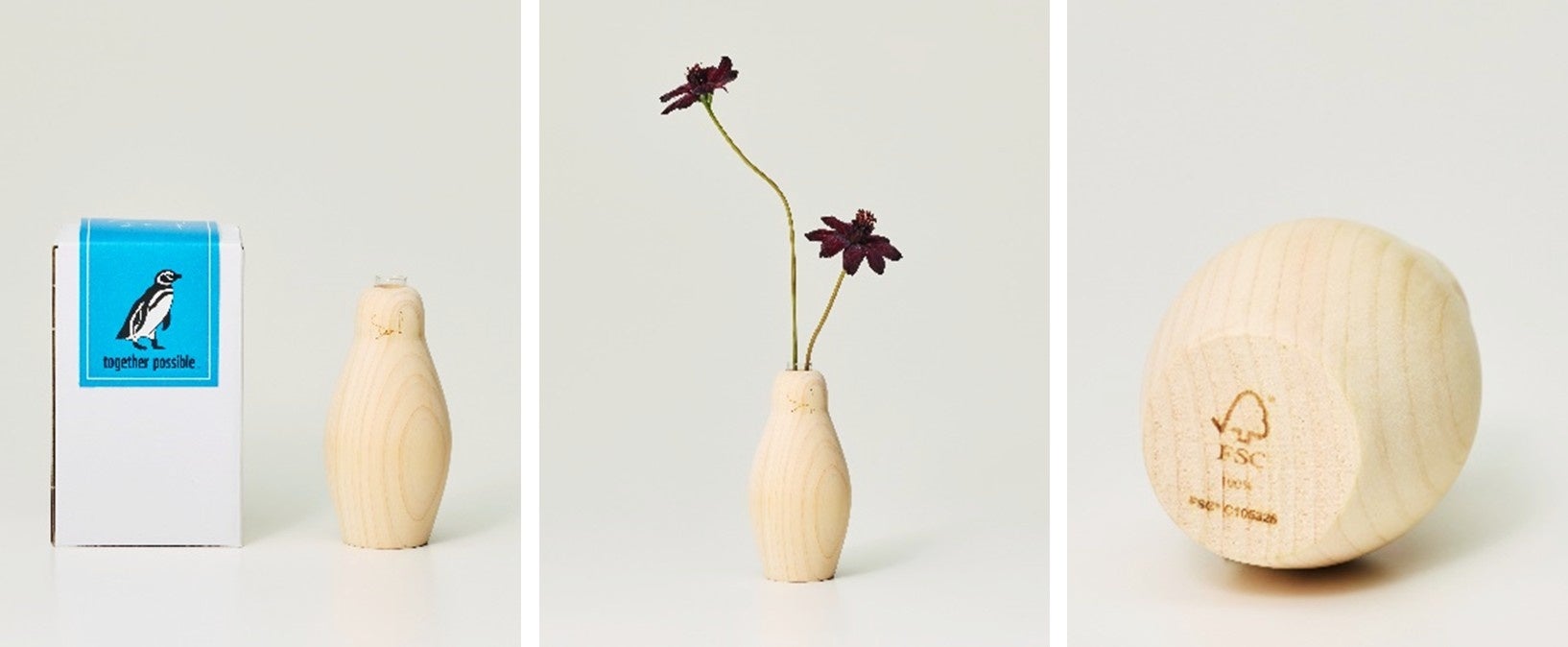 山梨県産のFSC木材を使用した木製一輪挿し。ころんとしたフォルムの手乗りサイズで、お部屋に気軽に飾っていただきます。ペンギンをイメージしたシルエットで、木目がペンギンの丸いお腹のように見える、温かみのあるデザインになっています。