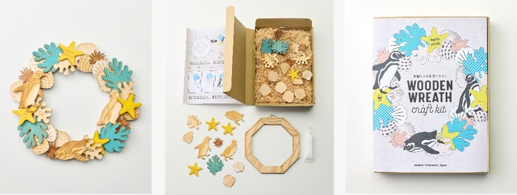 山梨県産のFSC木材を使用したリース組み立てキットは、ペンギン(マゼランペンギン)とその生息域の生物10種類のパーツで構成されています。