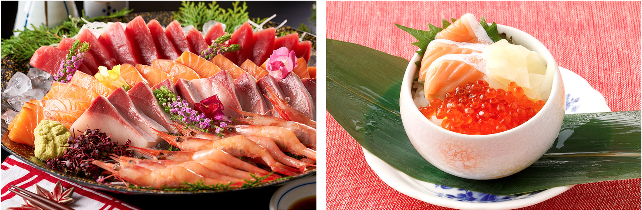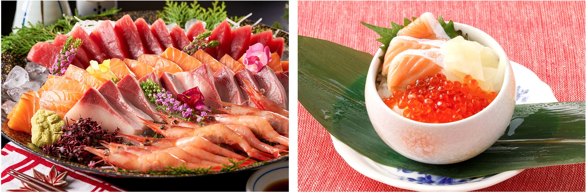 左:お造りは豪快に大皿でご提供いたします。とろける食感のまぐろやサーモンをお腹いっぱいお楽しみください。