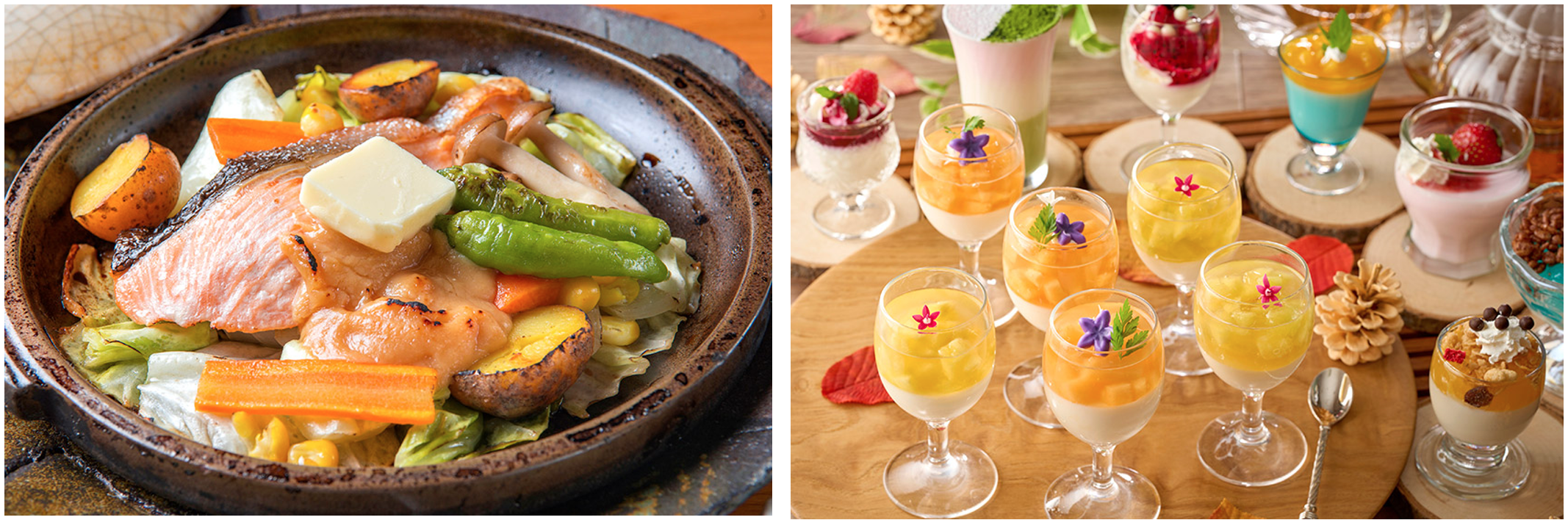右:ホテル鬼怒川御苑のディナーバイキングはデザートコーナーも見逃せません。小さなグラスに盛り付けらえた見た目も可愛らしいデザートやケーキなど、豊富なメニューを心ゆくまでお楽しみください。