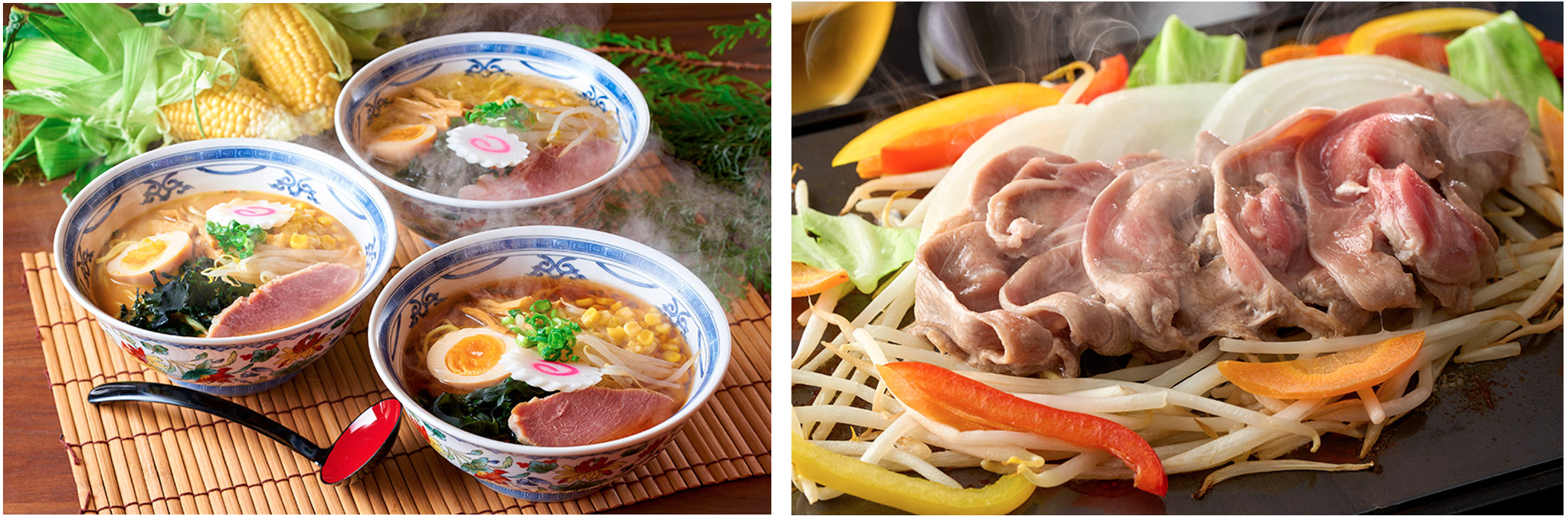 右:ライブキッチンには焼きたて熱々のジンギスカンをご用意いたしました。甘辛のタレが絡んだお肉とシャキシャキ野菜はそのままで食べるのはもちろん、ご飯に乗せて豪快に丼で召し上がるのもお薦めです。