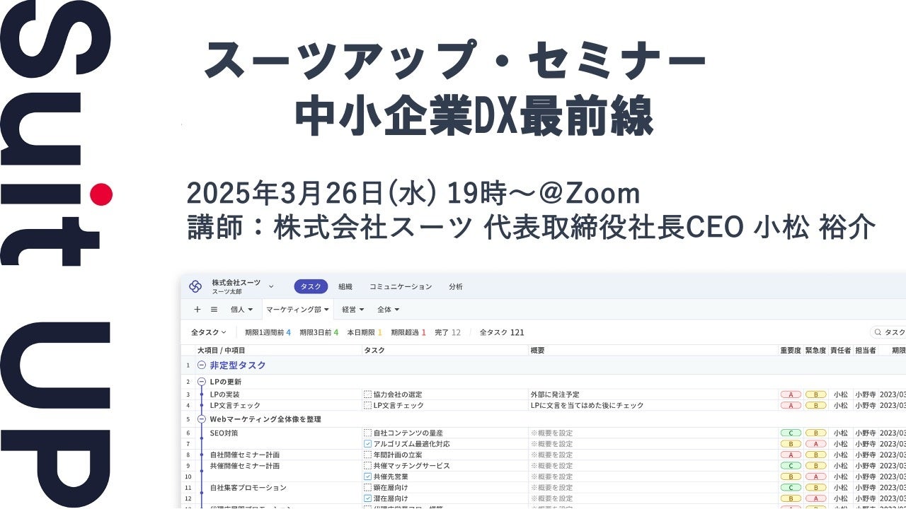 株式会社スーツ(所在地:東京都千代田区、代表取締役社長CEO:小松 裕介)は、2025年3月26日(水)19時から、当社代表の小松が講師を務めるスーツアップ・セミナー「中小企業DX最前線」を無料開催します!