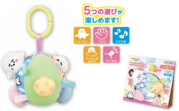 ポコポコの突起がお子さまの指先運動にぴったり。ぷしゅぷしゅを引き出すことで、ひっぱりかくれんぼ遊びもできる仕様。このおもちゃひとつで5つの遊びが楽しめて、ボリューム感満点。