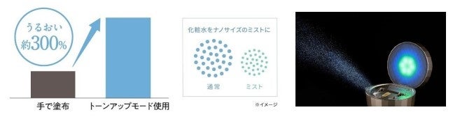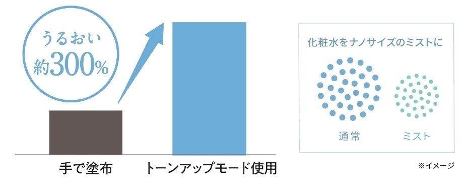 お手持ちの化粧水をナノサイズの細かいミストに変える化粧水冷ミスト機能を搭載。ナノサイズのミストをたっぷり浴びることにより、手やコットンで塗布するよりも約300%*3うるおいます。